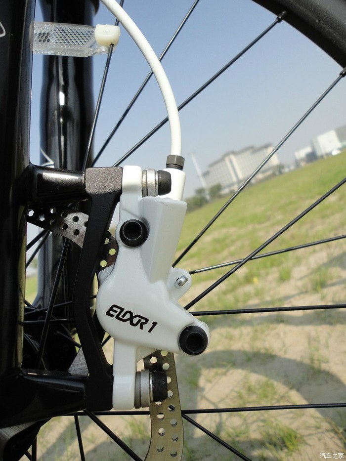 车把右边,E1刹把很润,铝合金的,做工质量都很好。不过这套刹车系统太过暴力,单指轻带就有很强的制动力,力量稍大很容易抱死,尤其是前刹千万不要大力刹车,后果很严重