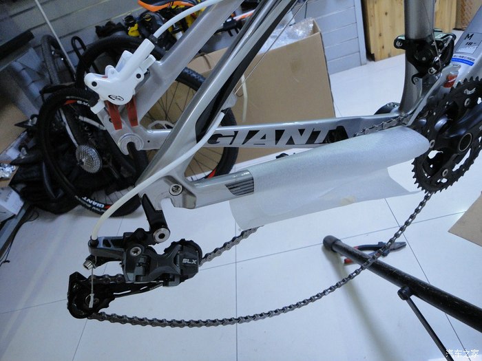 座管,也带有刻度标识。这个比较人性化,因为碳架不象铝架,不能用快拆式的座管夹,是螺丝固定的,有刻度方便记住位置。。。。。