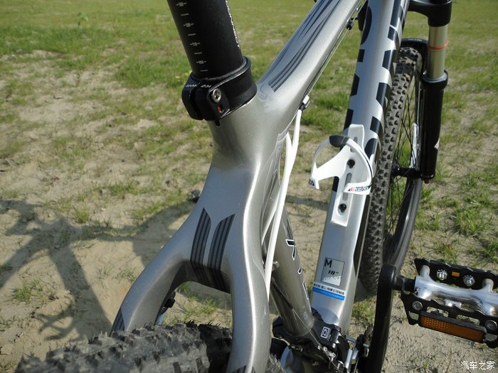 头管部分,那叫个粗壮,看着就敦实得一踏糊涂,碳架就是有这个优势,在不增加重量的情况下可以任意制做成需要的形状,还有一个最大的好处,也是我特别喜欢它的原因:全车基本没有焊缝,接头部分无缝对接,可以做得丰常的光滑,视觉效果和手感都是相当的好。。。。。。