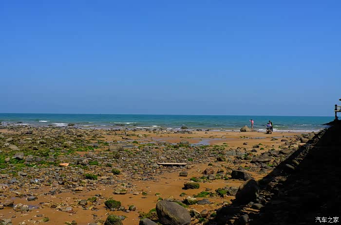 走完3公里下坡路,就进入博厚镇,然后又是平路,顺利到达临高县城,时间刚好是11时半。问路街上的人,临高角怎么走?答曰沿路直直走,过桥见路牌就继续走。说是直直走,但也是走了七拐八弯,好不容易穿过县城,来到县城边上,才见一路牌,"临高角10公里"。事先设计路书时知道临高角离县城有几公里,没有想到竟然有10公里之多。这最后十公里,往往都是强驽之末,感觉都是骑不动了。闪电罗罗不管不顾就继续往前走,我继续紧紧追,途中经过一个村子时也没有休息,屁股已经开始痛,虽然不断变换姿态,但还是不管用,也只好跟着紧追。往常10公里的平路对我们来说也就十多分钟的事,今天却走得异常艰难,腿脚都软了,似乎有走不完的感觉。来到临高角海边的时候,更是只见远远的海天一色,海水非常蓝,天也非常蓝,只是不见了传说中的临高角的纪念碑,不见印象中的木麻黄海滩防护林。一个房地产楼盘都把临高角的海滩开发得面目分非,未修好的路,未盖好的房子,未整治好的海滩和草地,到处见到随地抛弃的建筑垃圾。经过楼盘的工地,七拐八弯的才见到临高角纪念碑。临高角解放纪念公园被围墙围着,要买门票才能进入,我们选择直接从旁边的杂草地上直接进入海滩。中午时分,海水退潮,裸露的石头在沙滩随处散布,还有三五成群的游客在沙滩上玩耍。