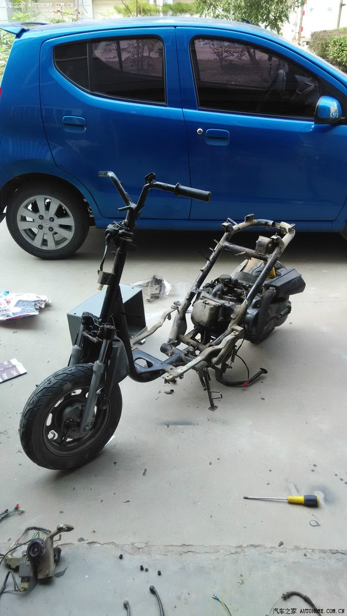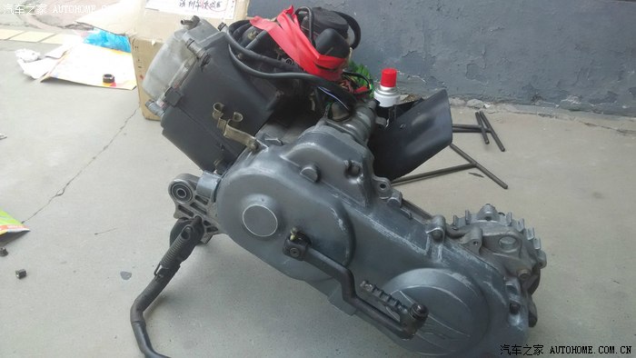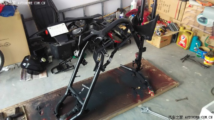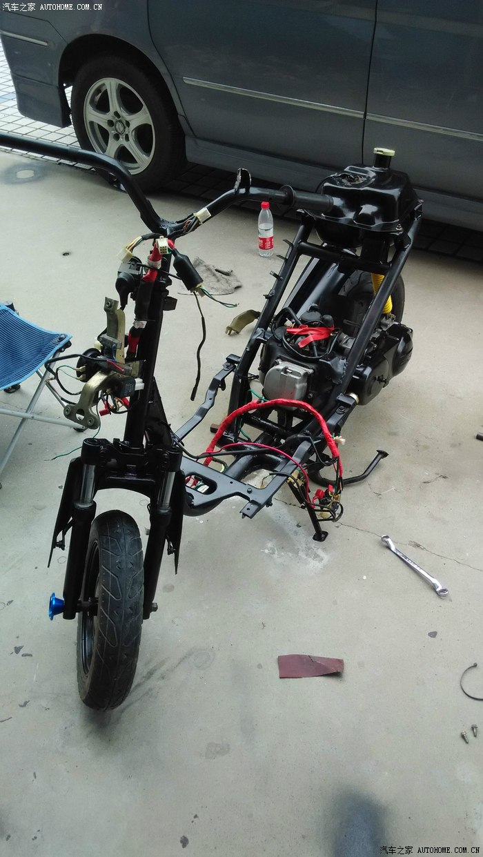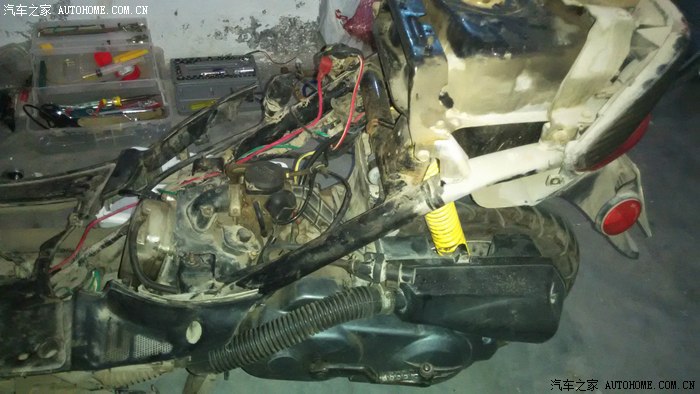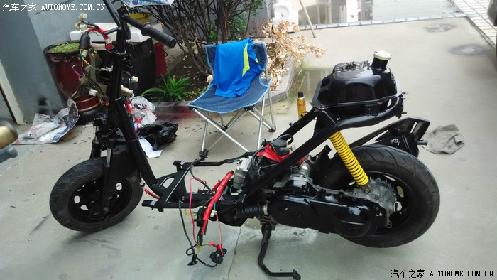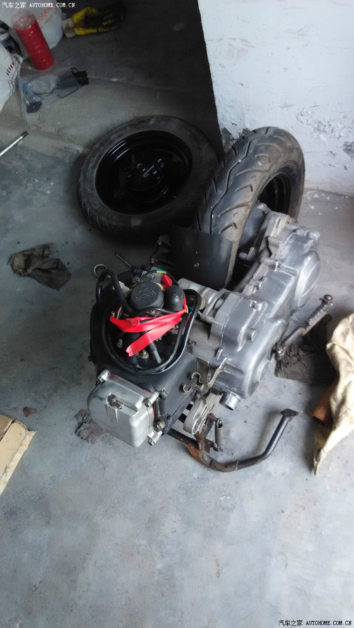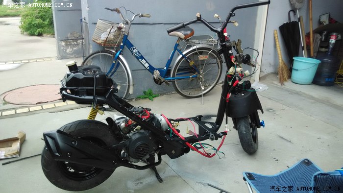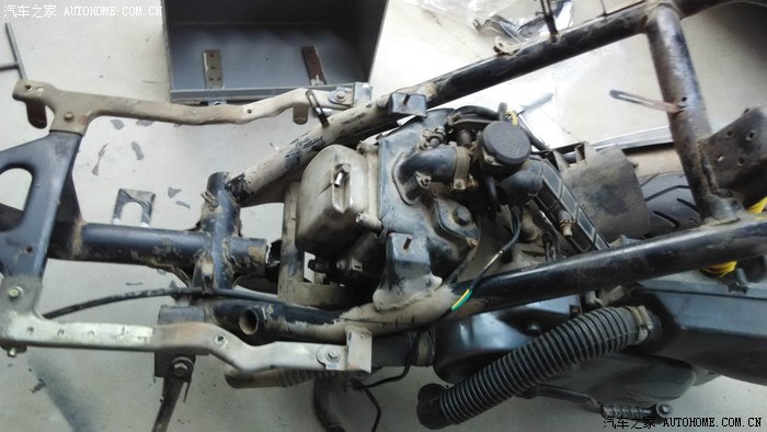 第五天开始装车,网购的副厂外壳到了、光阳原厂组合开关、后减震衬套、后视镜都先后到货了,大线、发动机装车,自己焊的发动机吊架安上试试还可以,脊梁骨挺起来了,后轮离地了
