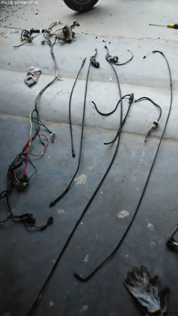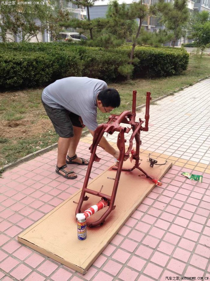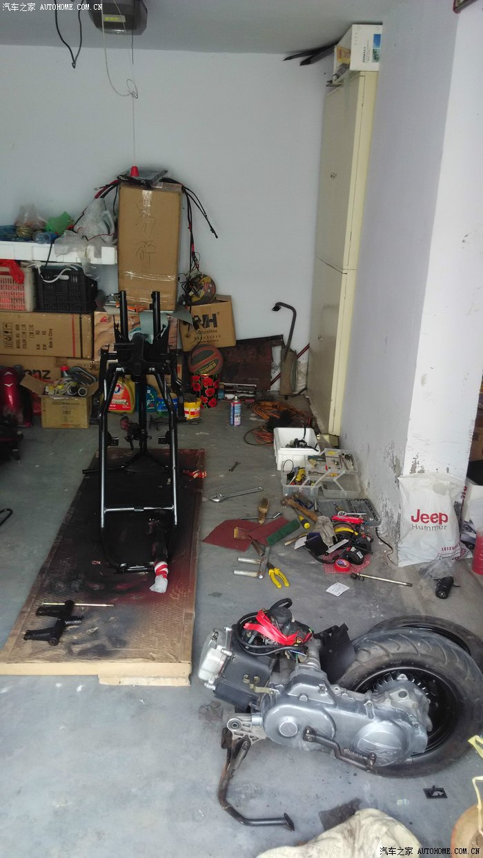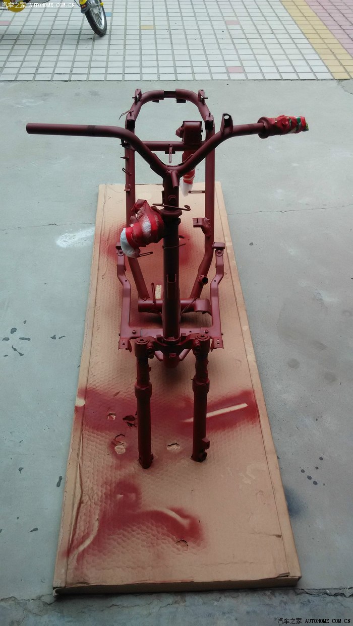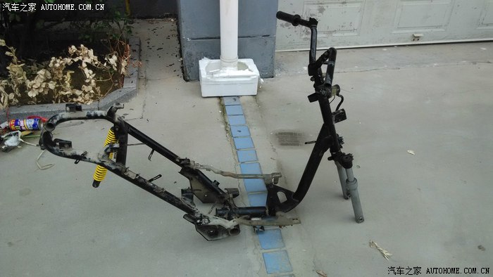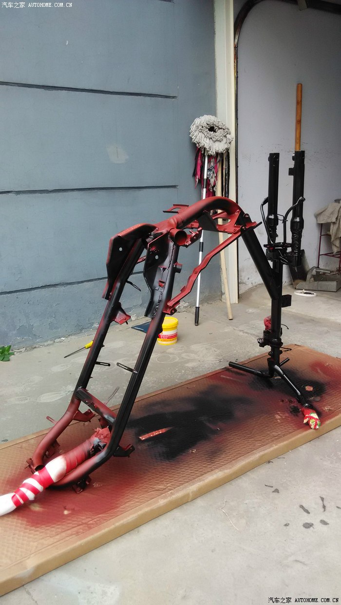 第五天开始装车,网购的副厂外壳到了、光阳原厂组合开关、后减震衬套、后视镜都先后到货了,大线、发动机装车,自己焊的发动机吊架安上试试还可以,脊梁骨挺起来了,后轮离地了
