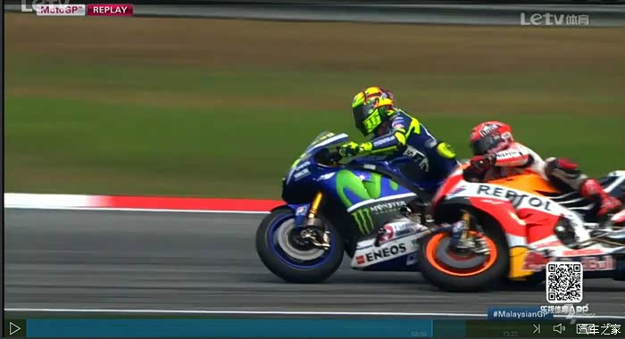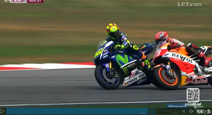 93有点蛮不讲理式的超车确实容易挑起火气,罗西抬膝盖感觉更多是一种发泄怒气的下意识动作。两人积分差距将近100分,应该没有什么理由有这么激烈的拼斗,结合赛后颁奖台99的离场,八卦一下,难道93、99这2人是好基友??