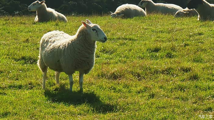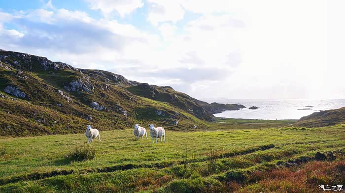 不远处一群绵羊默默低头啃草,身上涂着红色的家族标示,一只思考哲学问题的羊兀自趴在悬崖处远眺大海