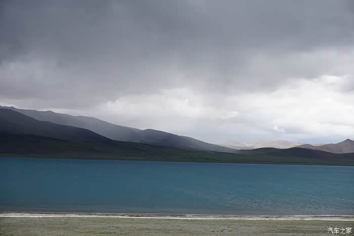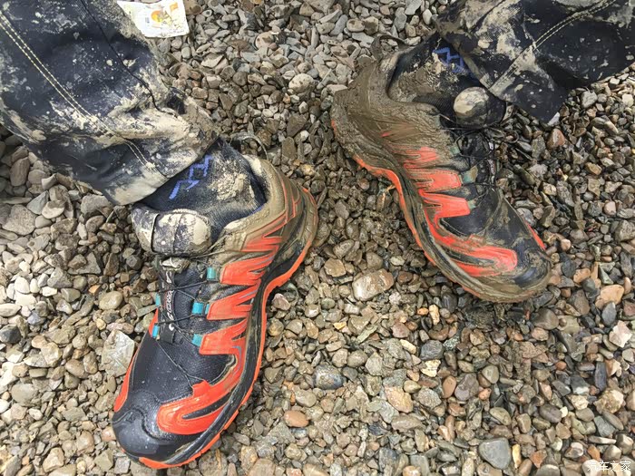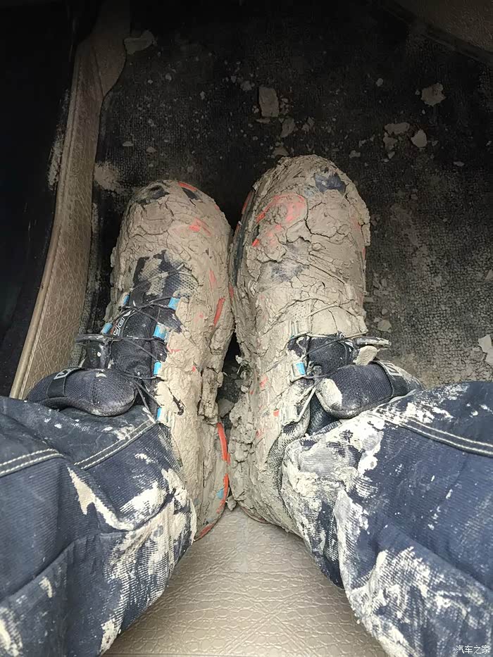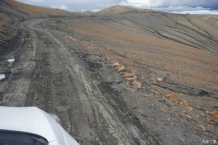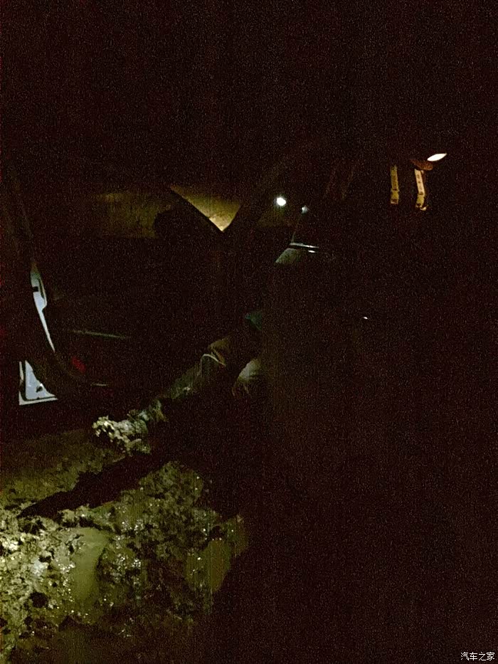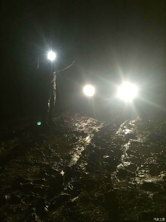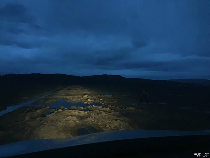 狭窄颠簸的路况还是很大的影响了行进速度,晚上9点钟,天快黑了,才赶到哲古错湖边,全是烂泥,如果不是地上有深深的车辙印,几乎找不到路。离措美还有60公里,如果后面的路都是哲古错湖边这样的烂泥,那至少还要2个多小时才有可能赶到措美。安全起见,我们决定赶到5公里外的哲古镇看有没有地方住宿。就在我们定好计划去哲古镇落脚后没多久,在深蓝色的天空下出现了一片泥潭,泥潭中间的车辙印显示着路还在继续向前,但是深深的车辙印已经交错成一小片烂泥塘,小妞不敢贸然继续往前开,我下来借着车灯的光仔细观察了一下路面情况,不行,太烂太深,直接通过肯定会陷进去,看地图显示右手边就是哲古错(湖),看来这一片曾经是湖边沼泽,也许是刚下过雨,也许是湖水漫上来形成了烂泥潭。小妞在我的指挥下尝试往路的右侧一片相对平坦的泥路上绕行,冲了一下很快就陷车了。换了我坐上驾驶位,前前后后试了几次终于退了出来。下车又仔细探查了一下可能通过的路线,又一次尝试沿着两道深深的车辙印冲过去,结果迎接我们的是又一次陷车,这次更深,退了很多次都退不出来,随着前轮的转动,轮下挖出来的泥越来越多,轮子陷的越来越深。下车从后备箱里翻出头灯带上,跟小妞一起深一脚浅一脚的在泥滩周围仔细搜索,想捡几块石头或木块垫在轮子下面,结果发现这片湖边滩涂上除了泥、浅草和土块,没有任何树木和石头的影子,好容易捡到两根拇指粗的小木棍和几颗鸡蛋大小的石子儿,连同十几块貌似很结实的土块一起垫在两个前轮下面,一加油门儿,瞬间都烂在泥坑里找不到了。从晚上9点40分左右陷车开始,折腾到半夜12点,眼看着天色一片漆黑没有任何机会脱困,看着满脚满裤子的烂泥,嗯,只能在车里过一夜,等明早天亮再作打算。还好车里有水有饼干,两个疲惫不堪的人随便对付两口就瘫倒在车座上,这地方连手机网络的信号都几乎没有,只有我的手机不停的换方向勉强能收到断断续续的微弱网络,就这样不断找寻着断断续续的信号给两边的父母报了平安,我们也终于可以放心在车里睡下。可刚睡下没多久,就听到雨点叮叮当当砸在车身上的声音,这一下心里凉了半截,到明天天亮,我们这个泥坑可就要变水坑,开车改划船了。