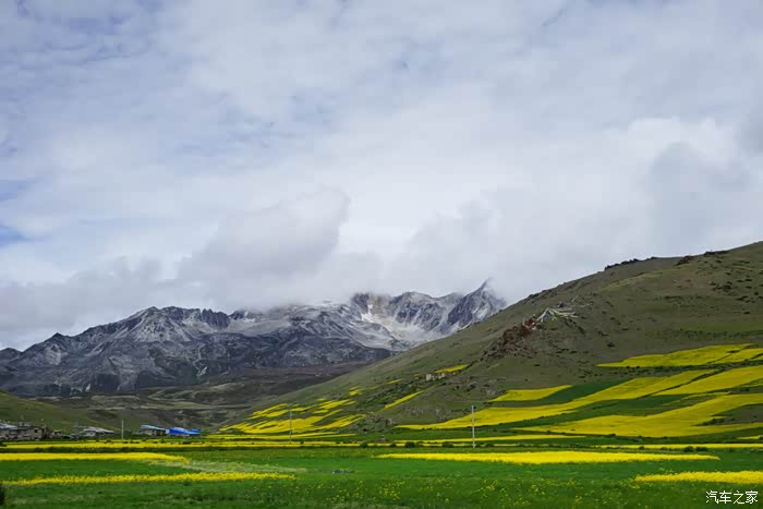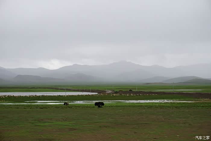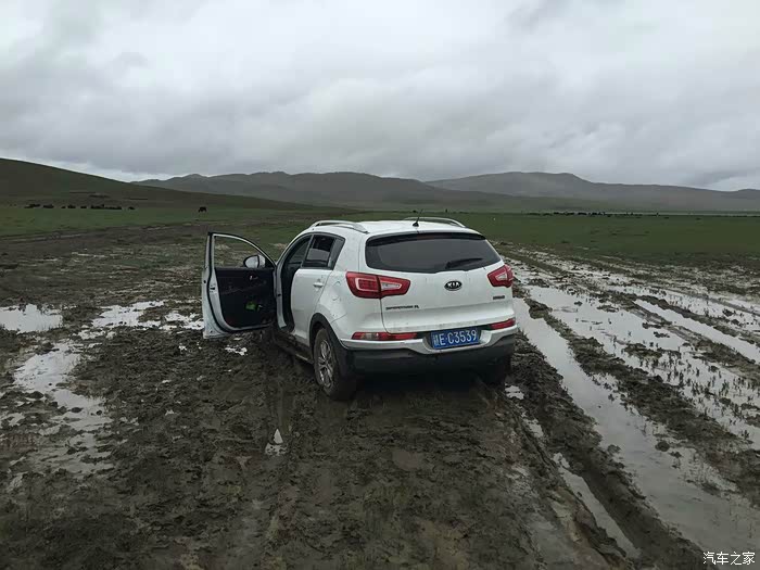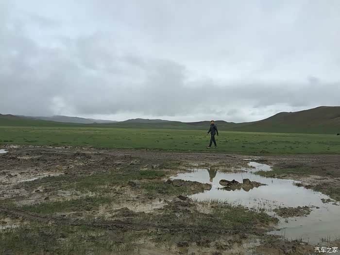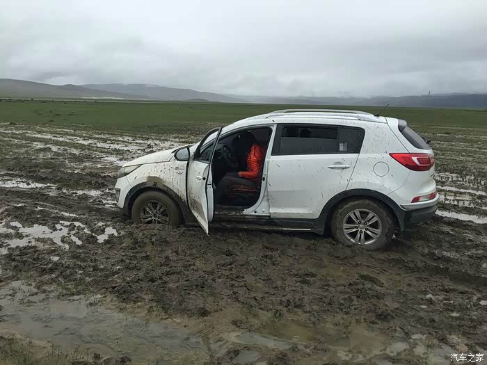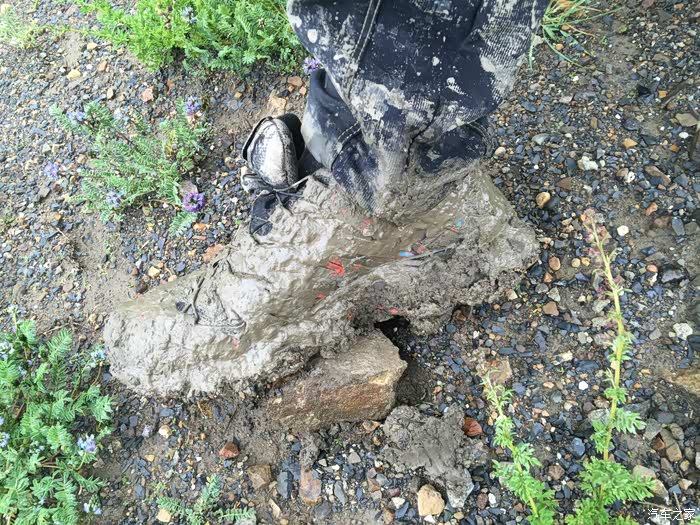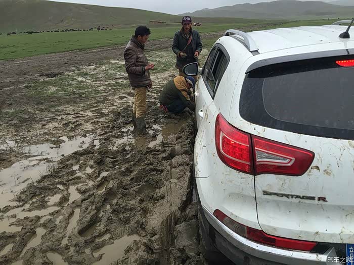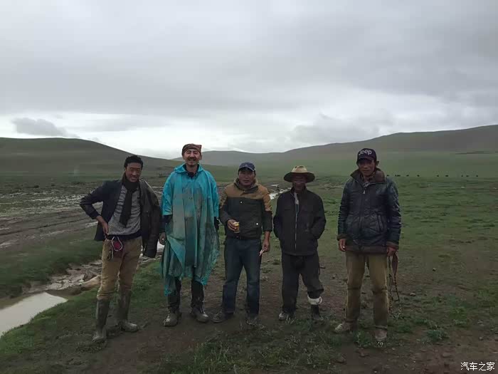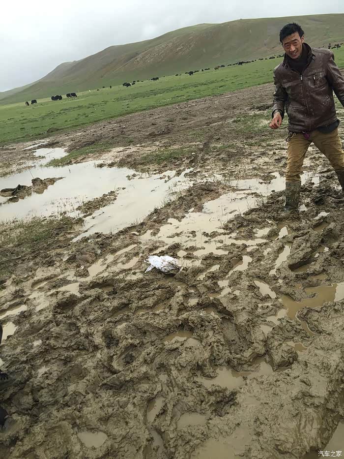 还好昨夜的雨不大,但是时下时停的雨让我们没办法开车窗透气,只好开空调换气,为了省油,开一阵儿关一阵儿,就这样伴随着雨声断断续续睡到早晨8点多天亮,打开车门一看,果然车周围的泥坑都被一晚上的小雨搞成水坑了。好容易淌着水坑从车里爬出来,走在泥坑里每一步都会陷进去,紧紧的粘住鞋,都快拔不出脚来了,眼望四周一片茫然,只看到远处有一群牦牛,想着有牦牛就该有放牛娃吧,就走过去碰碰运气。运气不错,有两个藏民在放牛,有一位还能说汉语,这下有救了!两位藏民跟我走到车边转了一圈,我们三个人试着推了一下车,纹丝不动。领头的藏民个子不高,身板很结实,叫单多,他用蹩脚的汉语让我等一下,他们去叫另外两个人过来,要试试5个人一起推看看。半小时后的结果是,5个大男人一起都没办法把车推出泥坑,陷得太深了。我正跟单多商量要不要去镇子上找个皮卡或者拖拉机来拖拽,其中一位长得瘦高的藏民骑着摩托往远处去了,后来知道他叫白马见参,也懂汉语。白马见参回来的时候带了一大包旧衣服,他们四个人分别把旧衣服塞到四个轮子下面,小妞在车里踩油门,我们5个在后面一起推,终于可以推出去一米,然后又陷住,再塞衣服,再推,再一米,就这样推了七八回终于脱困到了硬土地面。我们推车的5个人都被车轮溅起的烂泥沾的满身都是,单多他们带着满脸的泥点笑嘻嘻的看着我们,一句怨言都没有,他们担心我们路不熟再陷泥潭,四个人分头行动,单多和一个伙伴坐在我们车上一路指挥哪个水坑要从哪边过,白马见参和另一个伙伴骑着摩托跟在后面,就这样一路送我们跑了五六公里,让我们顺利拐到了水泥路上,他们才一起坐摩托回去继续放牧。原来他们四个人是一个生产小组,一起看管着镇上生产大队的170头牦牛,我们很感激,要给他们报酬他们死活不要,后来三推四让,小妞硬塞了二百元到他们的摩托车上说给他们喝酒,他们才勉强收下,看着他们四个满身泥泞心地淳朴的藏民,真心感动。