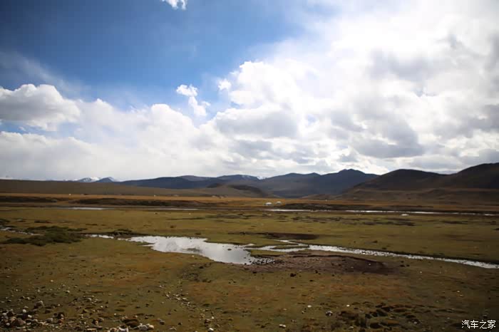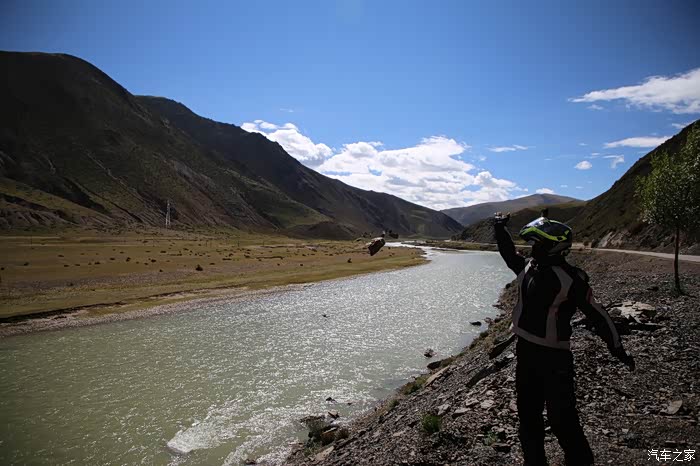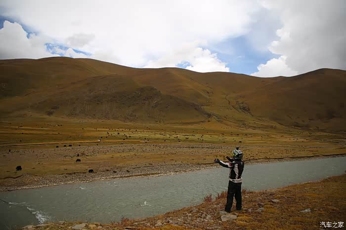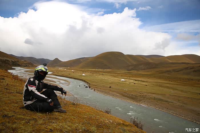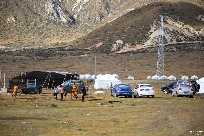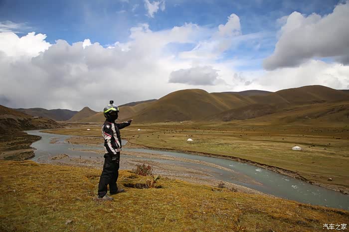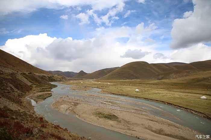 草原的一边是一片庞大的帐篷区,里面住的都是游牧藏民,估计他们也没有固定住址,户口本写的也就是这里了,帐篷修的很结实,草原上什么设施都有,一群藏族孩子在打篮球,篮球架非常简陋,这个地方也吸引了很多游人下来打扰他们的生活,我就是其中之一,车子在草地上走起来不太舒服,随时感觉要摔倒,骑到尽头是他们的母亲河,饮水做饭都在这进行。