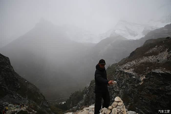 今天的天气不是很好,乌云密布,走到一半开始下雪了,地上全是冰,雪是越下越大,不少人都摔倒了,大部分人都戴着氧气瓶,景区有租氧气机的服务,这种机器有根管子可以直接接入到鼻腔里,我就不需要了,一次肺部气体压缩可以带走很多氧气,道路修的也不太好,大量的当地藏民都在从山上往山下背垃圾,女性和老年人占到了很大的比例,游客可不管那么多,认为交了钱就可以享受一切服务。