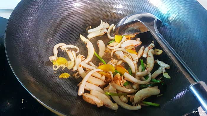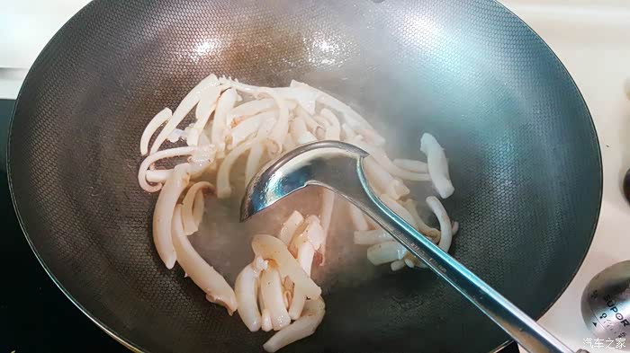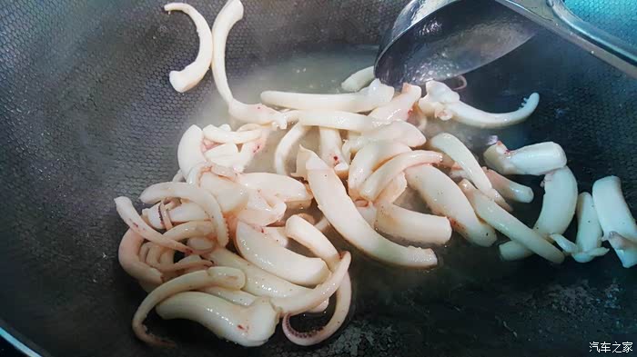 ▲一分钟以后鱿鱼须变硬,变色,这个时候已经可以出锅了