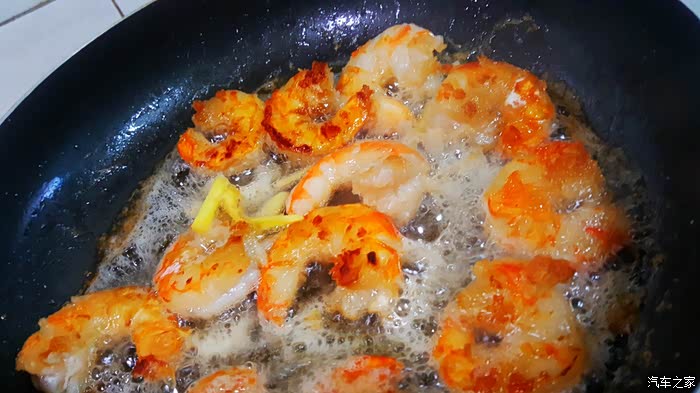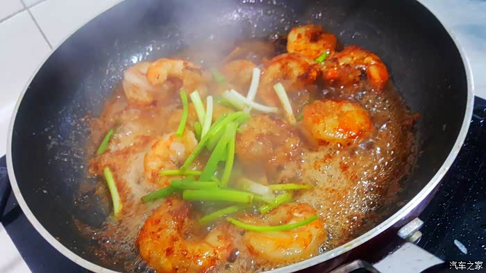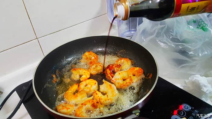 ▲加入一些酱油……想起以前炒虾仁时,就是用酱油直接喷上炒制,就可以了,做这大虾竟然如此,有些懒了