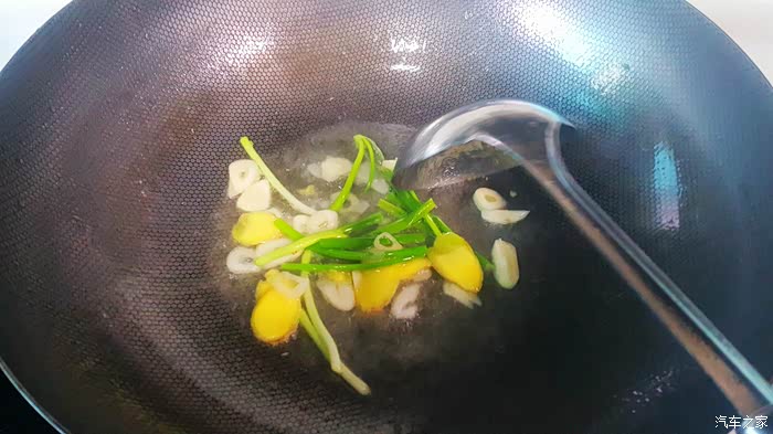 ▲加入姜片蒜片和葱,提味