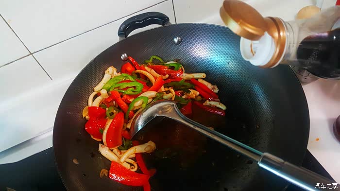 ▲加入酱油,但是把鱿鱼掀开,我打算把酱油的味道先炒出来,再搅合匀
