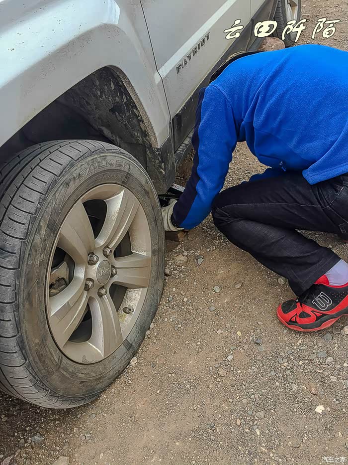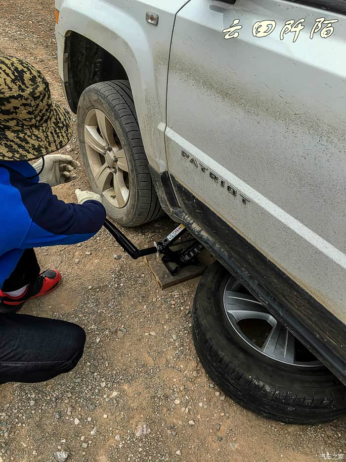 按照安全标准程序,出发时特意带了两块长方形硬木板,就是为了在这样地面不平的地方换胎。