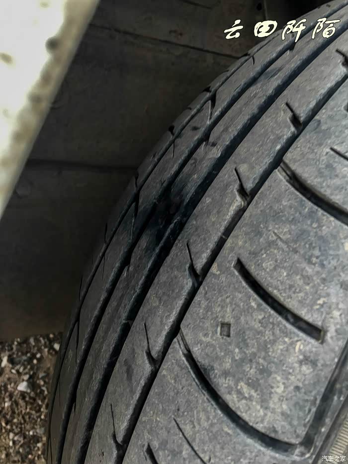 下车一看,左前轮被碎石扎破了!很响的漏气声。