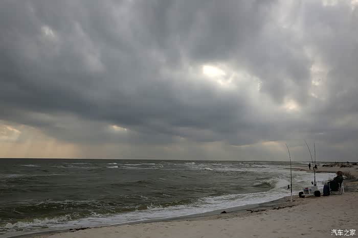 老婆骑车我开车后面跟着,一直到了小岛的最西边,路没有了,全部是海滩了,乌云下浊浪翻滚!