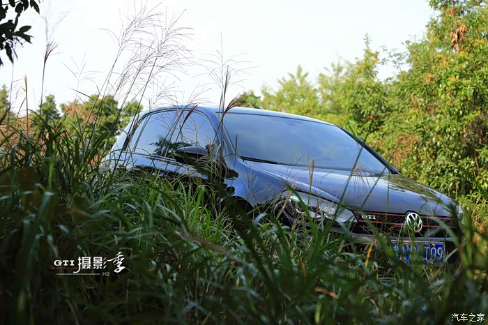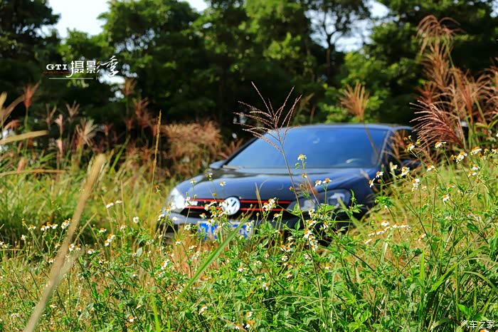 黑色GTI完全融入到花草中,一种别样的感受,在城市道路里享受不到的清新。