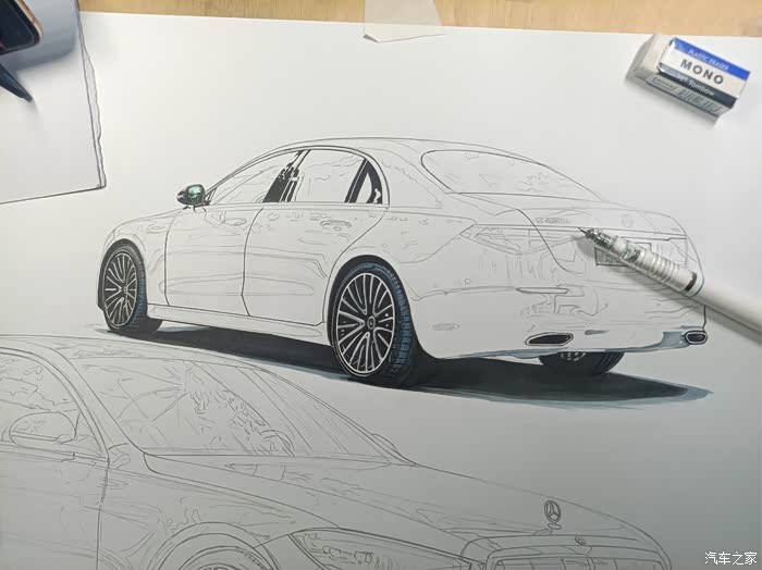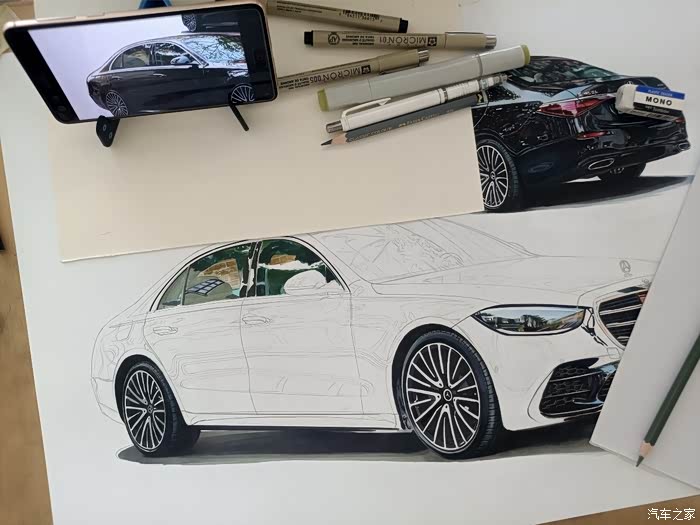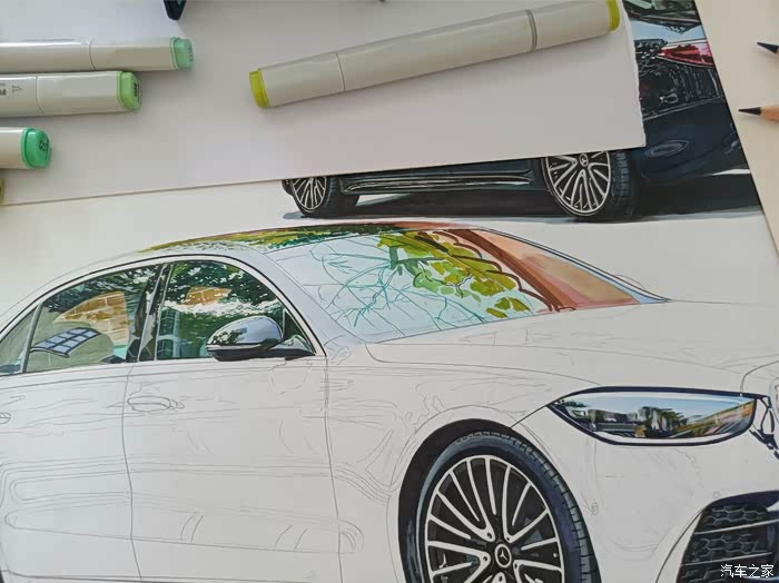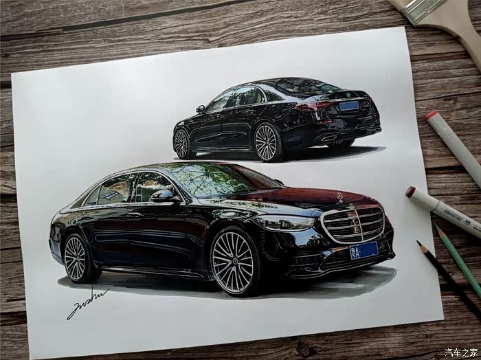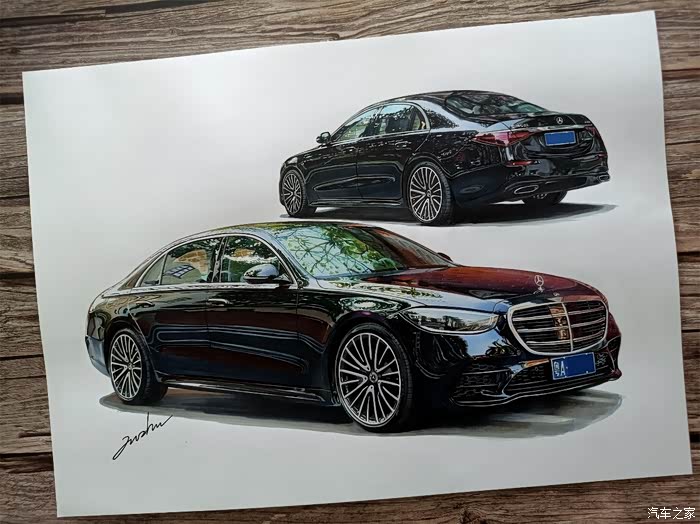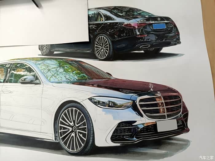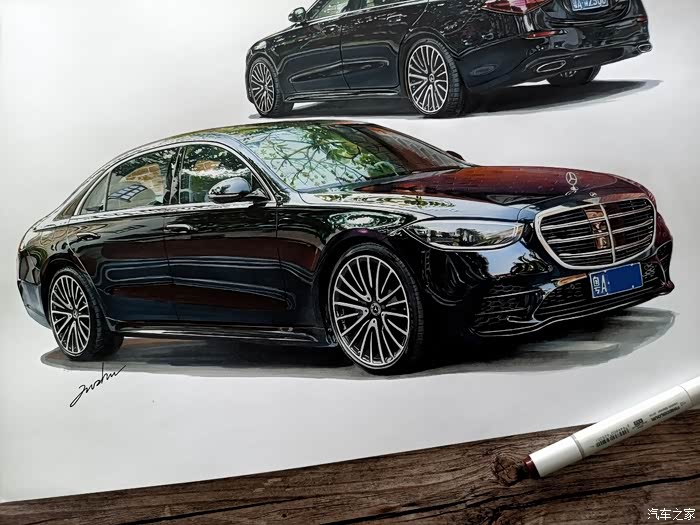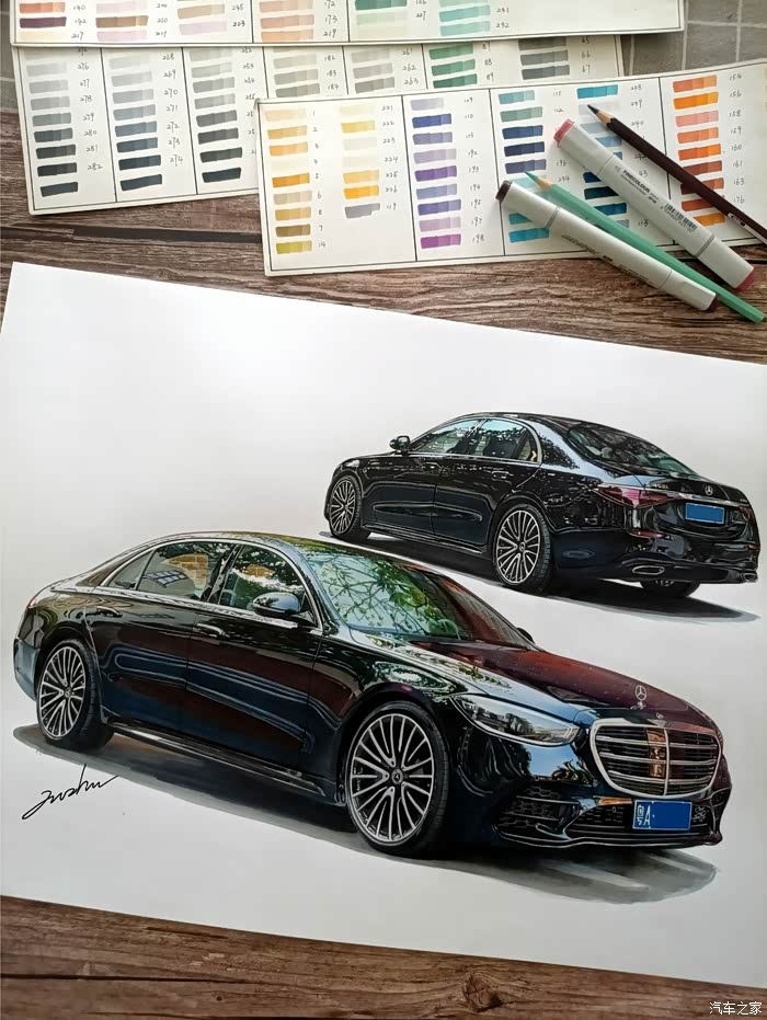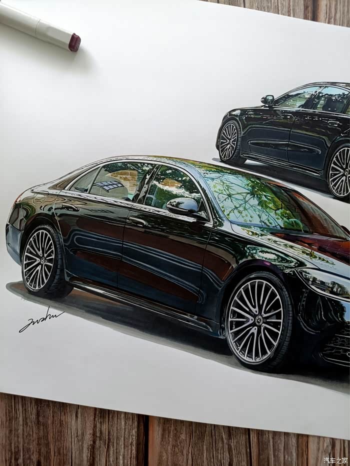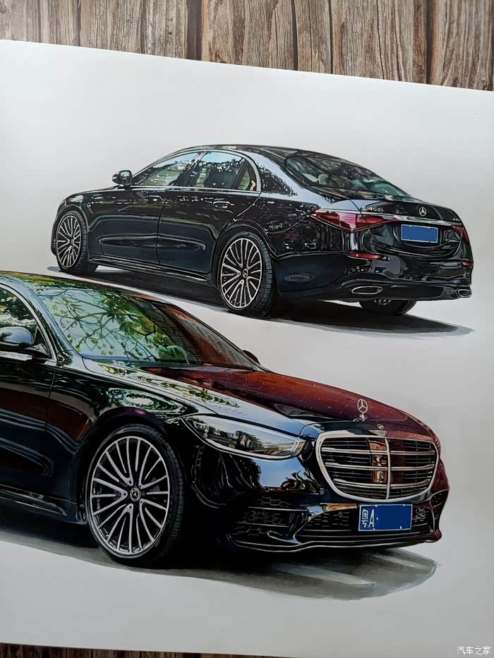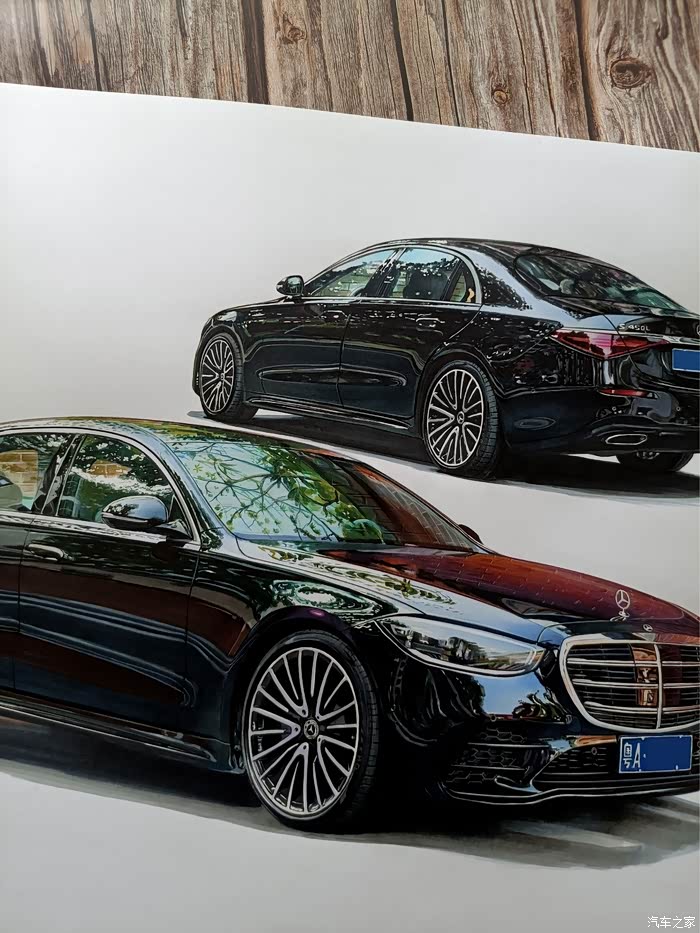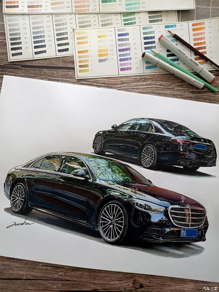 这辆奔驰S级是一位朋友的,只因太爱车,想把自己所买过的车都用手绘来表现出来,我也说不上来这是他第几辆车了,下月他订的车又要到货,到时要再画新的一辆 。