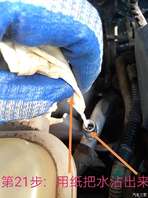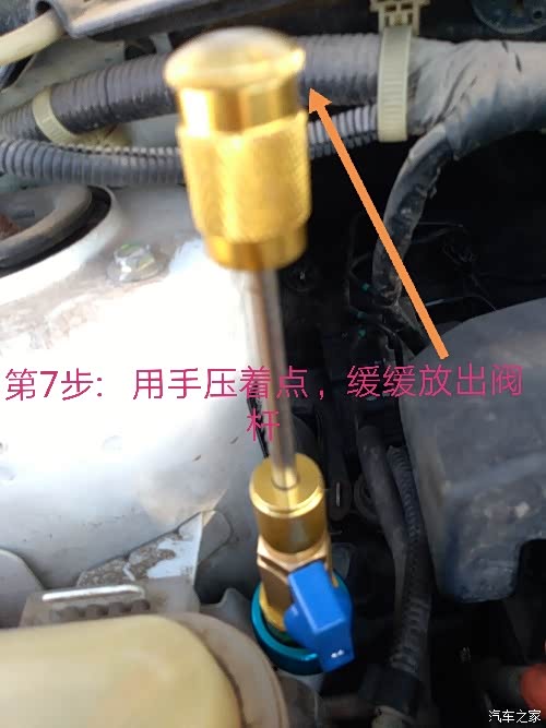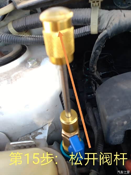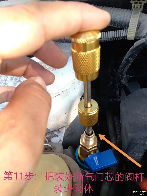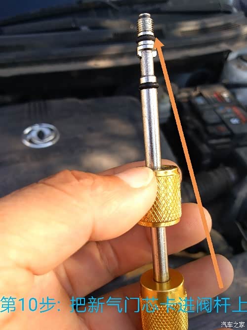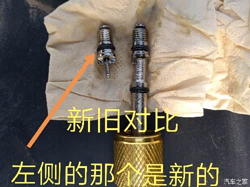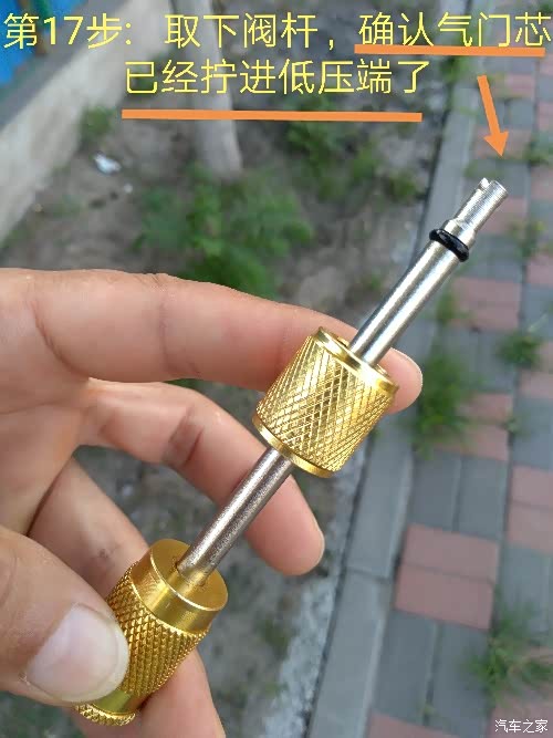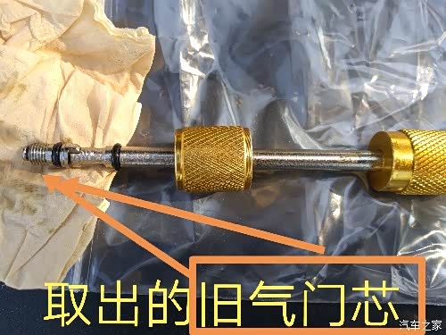 拧开高低压端盖子,往里面倒满水,高压端没有气泡,证明不漏气;低压端不断有气泡冒出,证明低压端漏气了!我马上开车去修车师傅那里,我亲自用他拆装空调气门芯的工具拧到最紧,然后倒满水检查,还是不停地冒泡,还是漏气,证明这个空调低压端气门芯彻底坏了,只能更换新的。我问他有没有空调气门芯,他说没有。