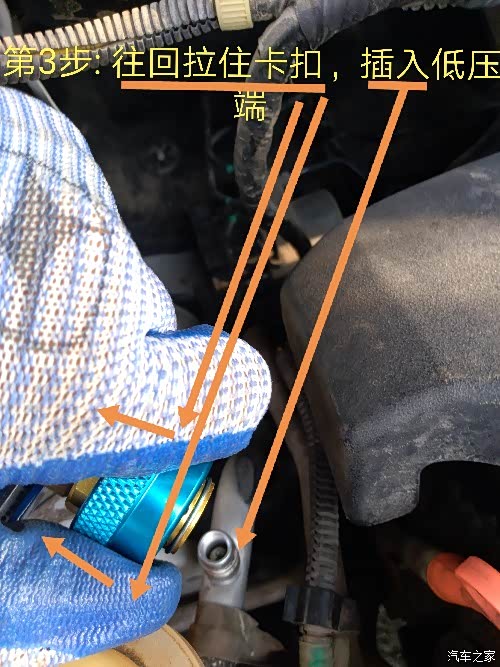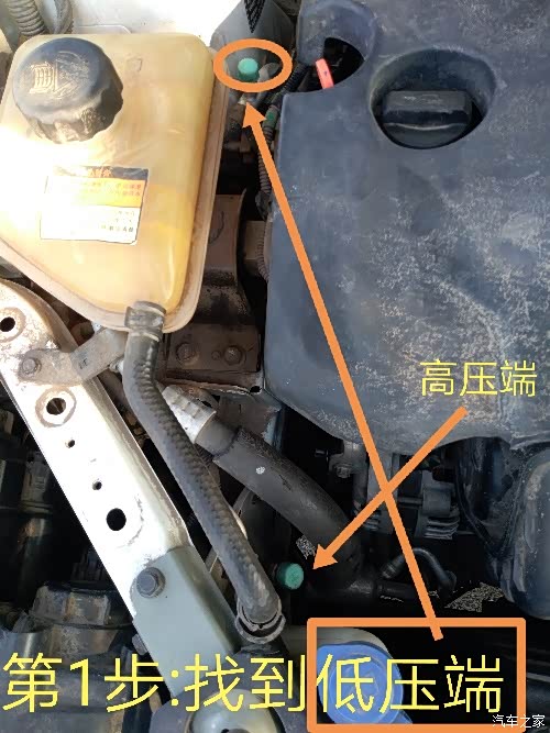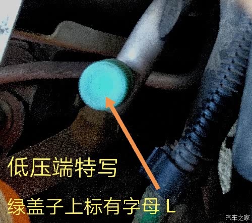 首先找到低压端并把低压端帽子拧下来,绿色帽子上标有英文字母 L (车型不同的也可能是黑色的帽子,但是不管帽子是什么颜色,只要帽子上标有英文字母 L 的就是低压端)。