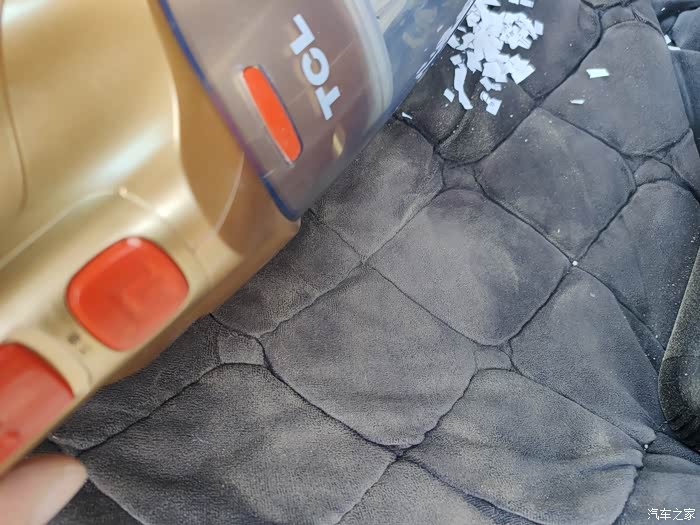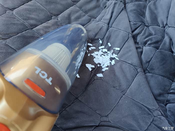 对于车内的清洁,最常见的杂物就以沙粒为主,但因为车辆座椅 门槛等原因,无法完全清洁干净,这是一款吸力巨大的车载吸尘器就显得格外重要了,在这一方面TCL经过短暂的操作即达到了对于图片之中所有沙粒的清洁,满意表现