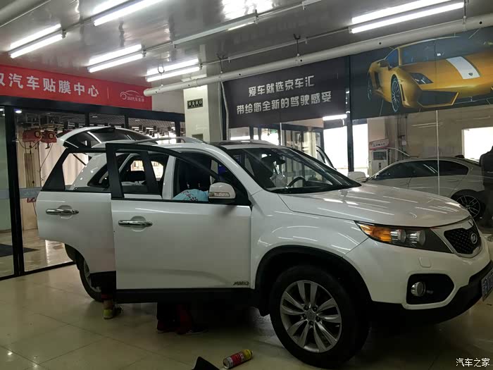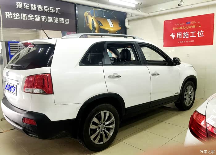 将车停在京车汇家家商城北京特约施工店专用施工工位上。