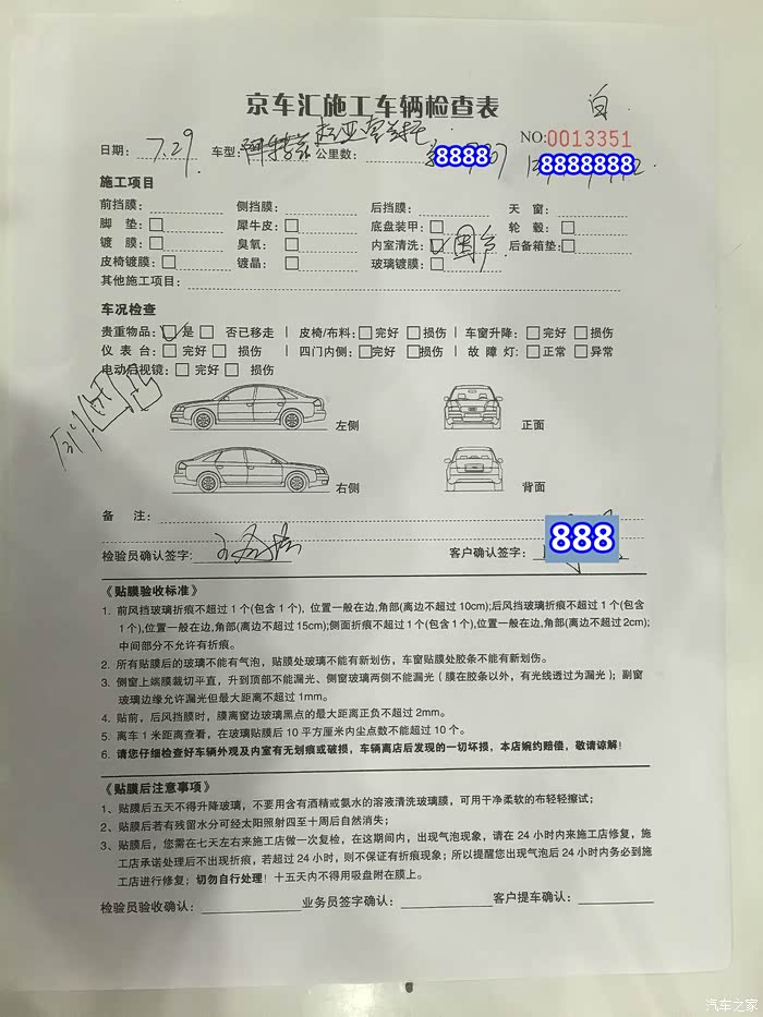 进到店里,接待确认名单后,首先进行车况检查,并在施工车辆检查表上确认签字。