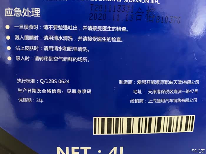 上汽通用汽车纯正配件,4L装的自动变速箱油。