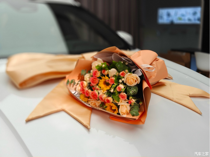 验收完车辆,确定没问题后4S店为我们准备了一个简单而温馨的提车仪式。还送上了一束鲜花和一些车内用品,如原厂脚垫、后备箱垫等。