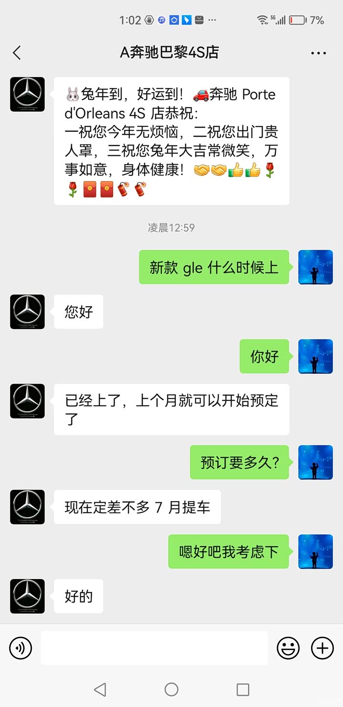问了下巴黎的奔驰4s店2月份已经开始接收预订 7月份可以提车
