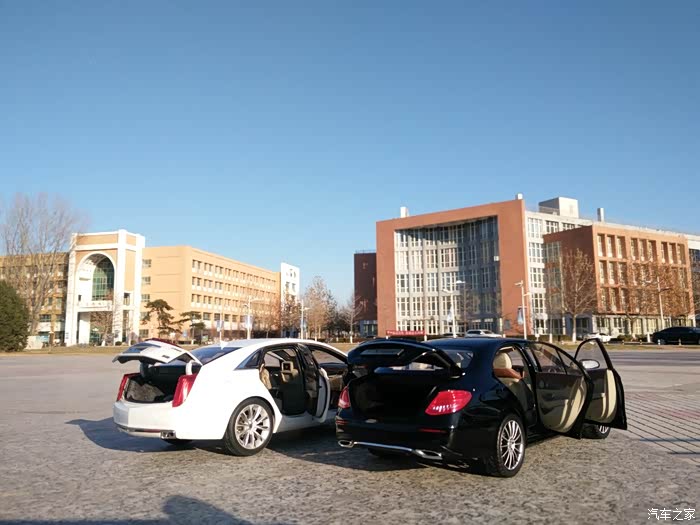 相信这两款车的真车,大家都不太陌生吧,奔驰E级,豪华中型商务轿车的佼佼者,今年完成换代后,竞争力全面提升,立标,大标,短轴,长轴,各种定位的版本共同投放市场,喜欢这车的买家一定能够搭配出自己最满意的组合,在竞争力大幅提升的同时,价格并没有比老款车型高出多少,总之,这是一款集豪华,舒适,档次感于一身的行政级座驾,是社会中高端人士购车的首选之一; 凯迪拉克XTS,上市较早的一款车,该车主要的卖点就是其超高的性价比,它几乎是这个级别你所能买到最便宜的中高级轿车,超过5米的车身尺寸,也属同级别数一数二的,稳重而不失大气,但该车的缺点也很明显,就是技术层面相比竞争车型没有什么优势,另外就是长车身,短轴距带来的侧面视觉效果不太好,车内空间优势不明显。