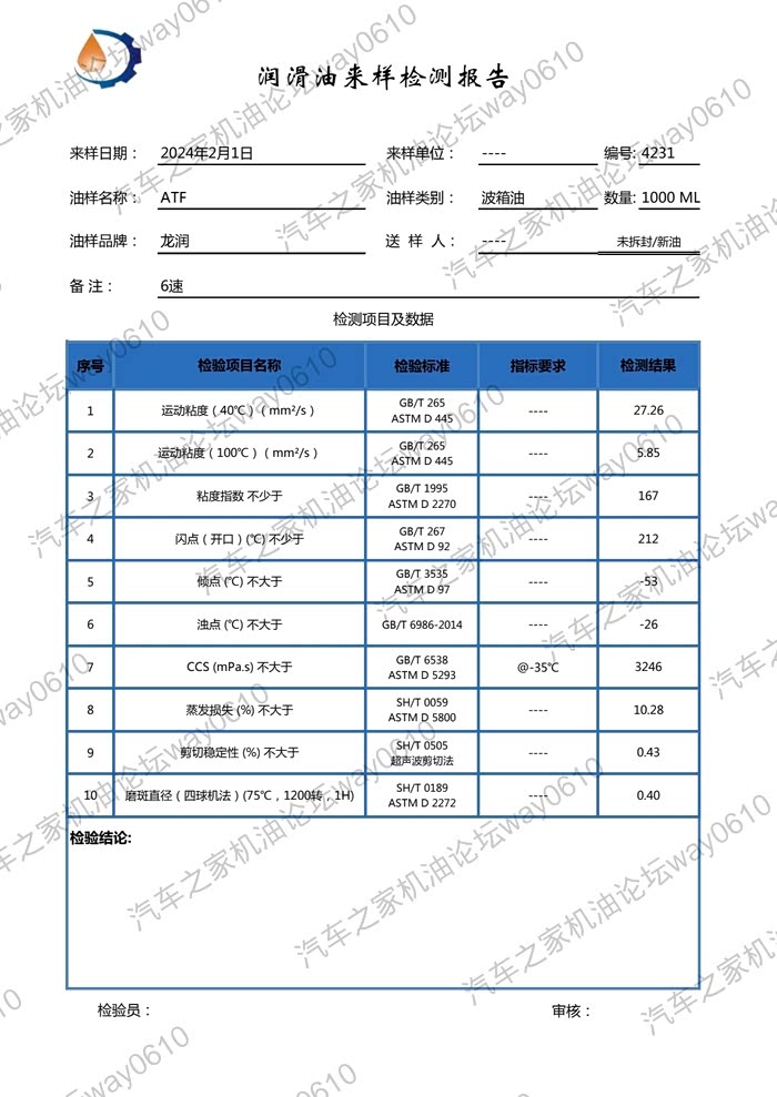 8.蒸发损失,龙润10.28,因为变速箱是密封的,油蒸汽不会参与燃烧,所以蒸发损失不是很重要的指标,但它可以反应油品的好坏,10左右的蒸发损失对于ATF来说算是很低了,基础油很优秀。