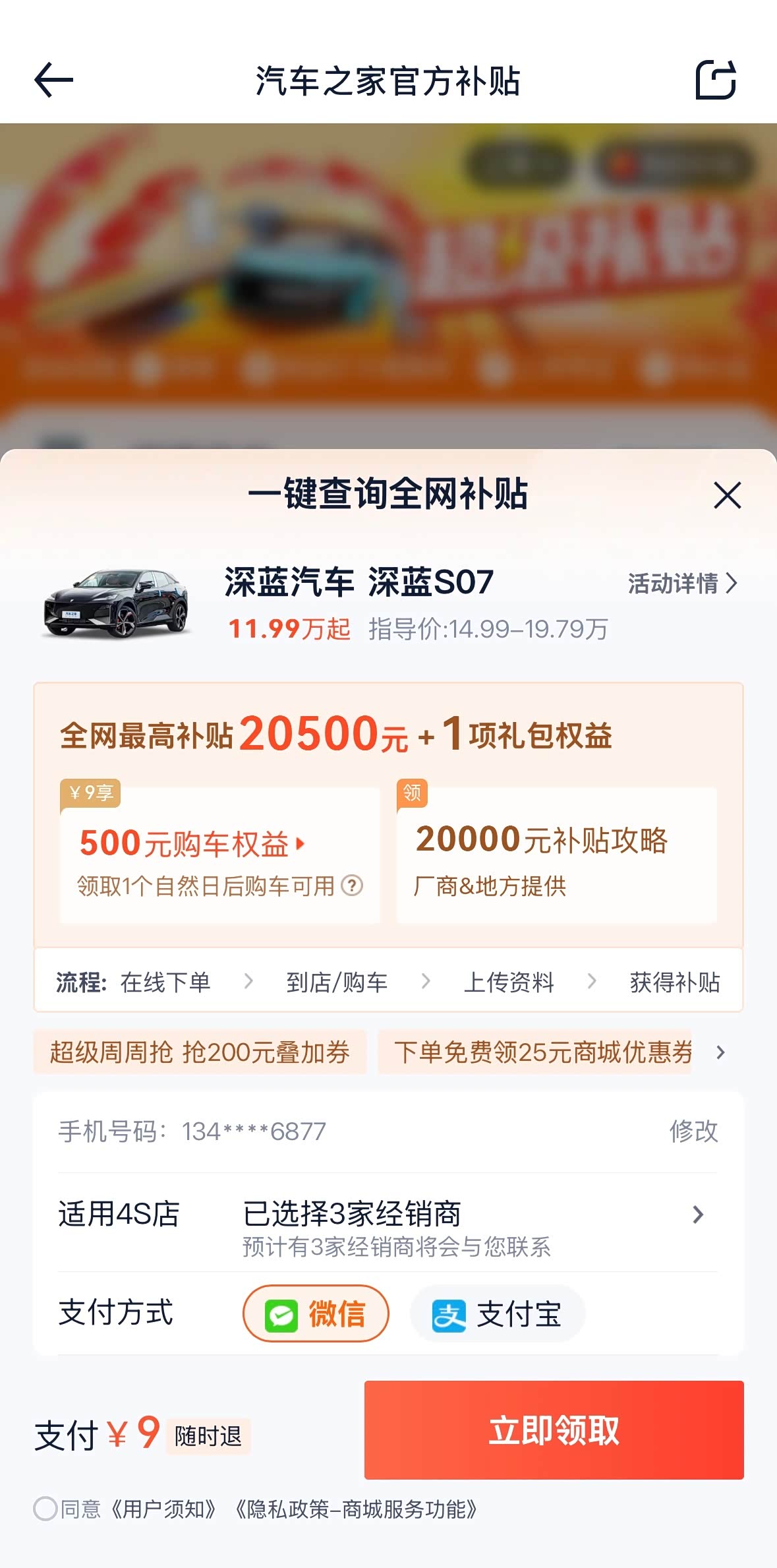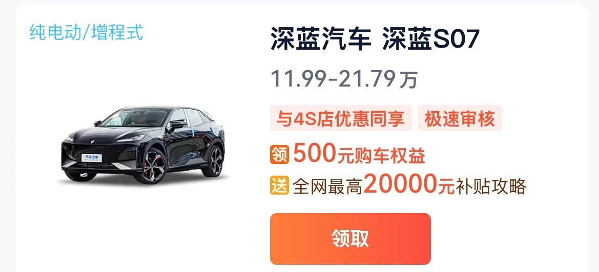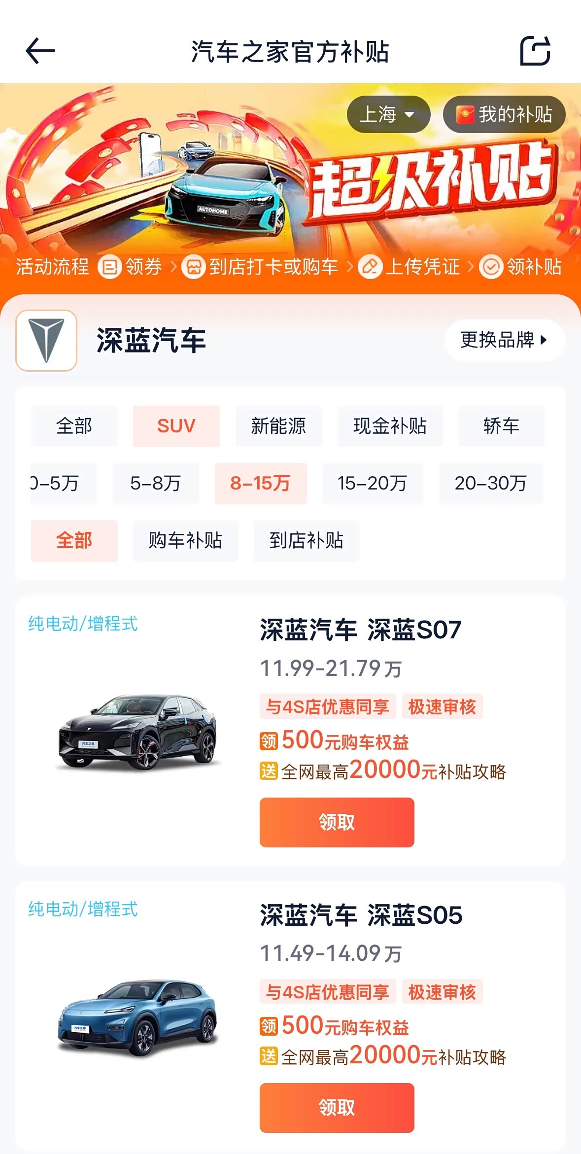 汽车之家购车补贴说明(购车前在汽车之家APP上领取才可以) : 汽车之家官方的补贴活动,覆盖上千款车型都可领取,最高可领4000元补贴;且与厂家无关,可与4s店优惠同享优惠。如:深蓝所有车型就有500元的补贴,且与4s店优惠同享; 购车之后上传凭证至汽车之家 APP, 审核通过后会发放购车权益至汽车之家 APP 账户,非常简单方便,只要动动小手就能拿500元。