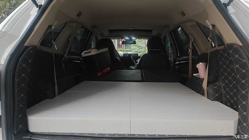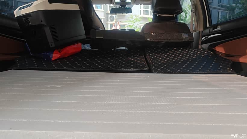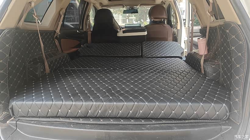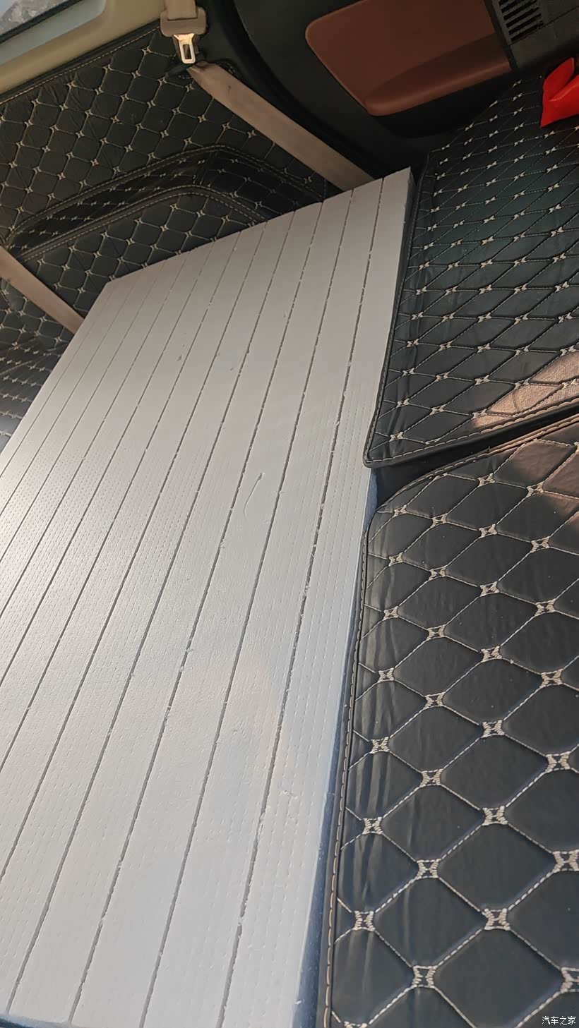 在装饰城买两张120公分长,60公分宽,够8厘米的挤塑板,(八公分厚和第二排座椅还是有稍微的高度差,但是可以接受,如果想纯平那就考虑10公分厚的,但是会挤压与车顶的高度,价格也会贵一点)第一块切割成112公分长的,正好可以放下,第二块前面切割成112公分,后面的不动,尾门那里两个角需要切割,正好可以放进去,铺好之后上面可以再铺一层薄木板或者铝塑板,可以更结实,我是原先包车门,尾门的时候剩的皮革,把两块挤塑板分别包覆,方便后期抬座椅的时候可以随便拿取。