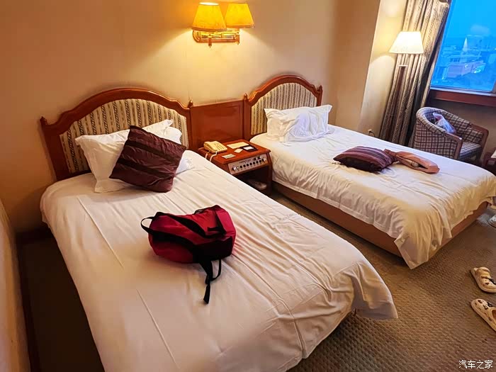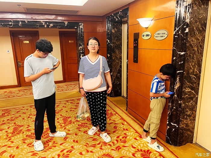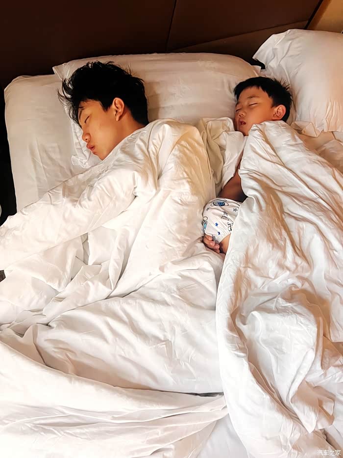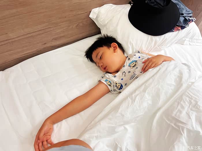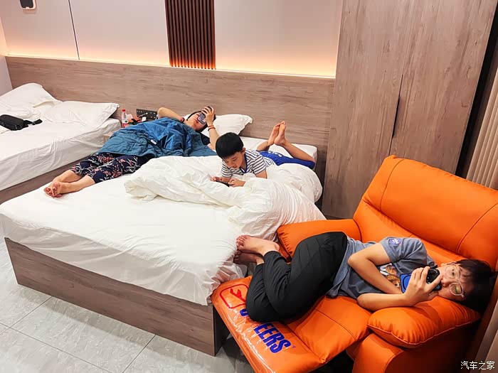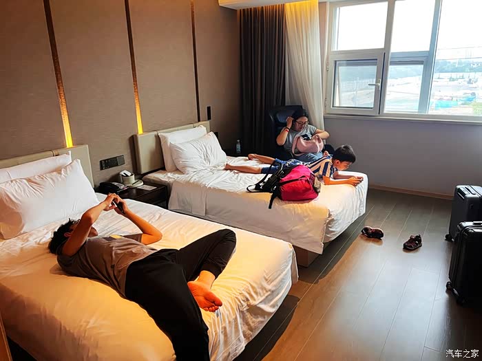 酒店办理入住,先躺一会儿,俩孩子真是手机迷啊。