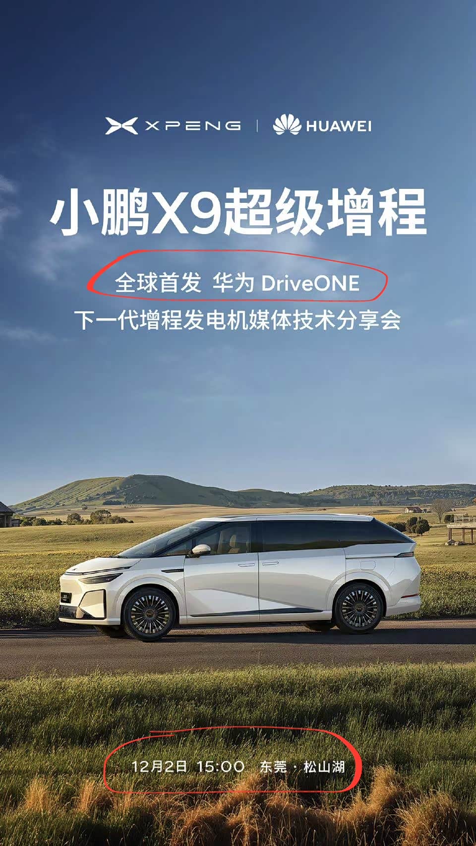 今天小鹏开技术分享会,发布X9超级增程用的华为DriveONE电驱。本来小鹏和华为合作这个事就很有看点,结果更有看点的是竟然是号称全球首发!