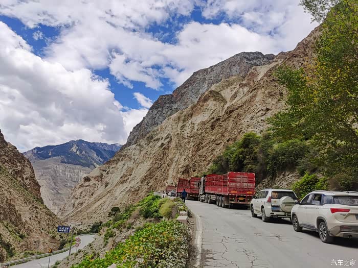 一早退房,看到酒店前台的卓玛在吃苹果,感觉很好吃的样子,问哪里可以买到,藏族小姑娘马上拿了一小袋给我,我要付钱给她,说啥都不肯收,说是自己种的,送点给我们尝尝。昨天入住免费给我们升级了房型,现在又送我们水果,于是又带着这份沉甸甸的善意继续上路了。今天要翻越业拉山,我们做好了打持久战的准备,结果才出城就遇到堵车。其实从离开然乌镇,G318沿途都在修修补补,有些路段采取单向通行的方式,堵车不可避免。抱着既来之则安之的心态,堵车就停下来欣赏风景。