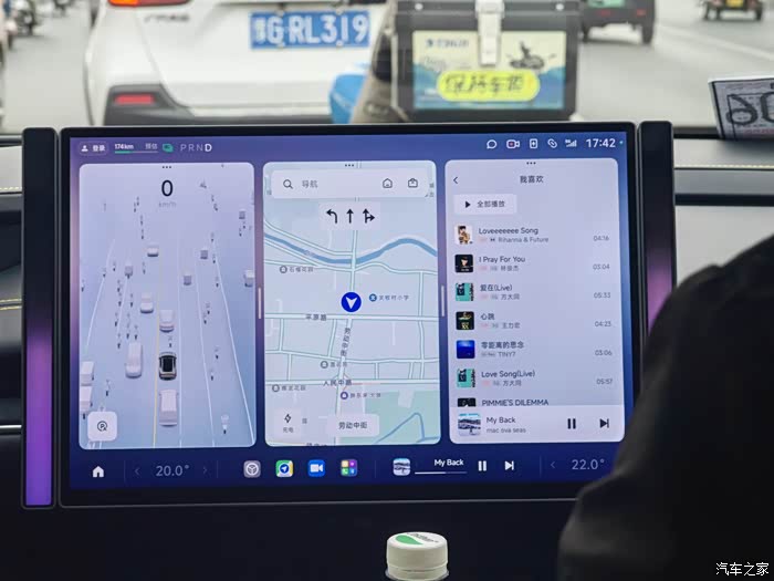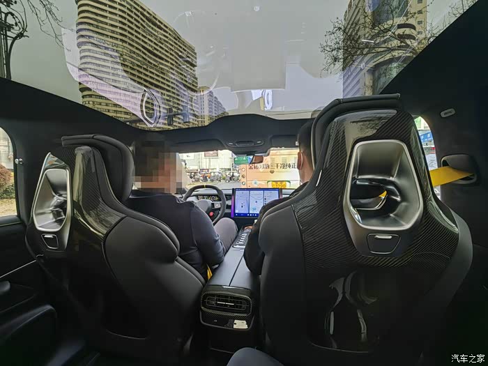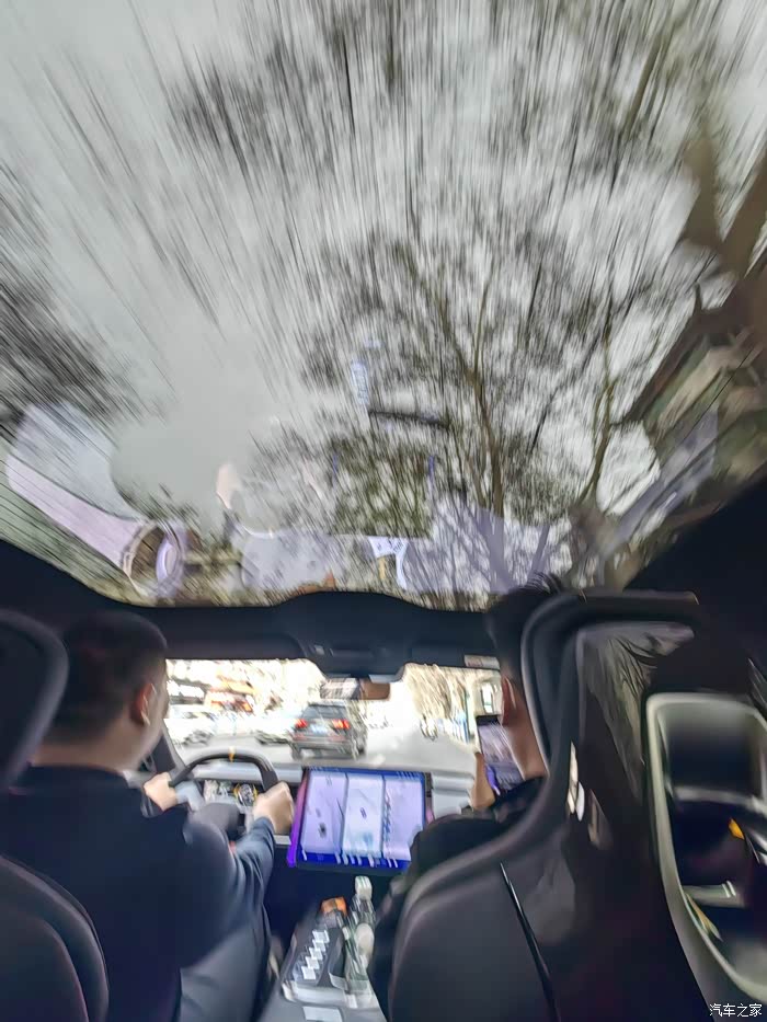 上车后最让人印象深刻的就是超大的中控屏幕和全景天幕,中控屏分三个板块让人感觉科技感满满,而且激光雷达的加持下识别率很好,我在路口等红灯的时候专门数了数,二十米外斑马线上的人一个不漏的识别出来,包括并排走的人都能显示出来。而天幕是真正意义上的全景天幕,而且不是那种平平的一块,有不同的曲度,让我这个乡巴佬涨了见识。乘坐空间上乘,运动座椅比较硬,但支撑还是很好的。车门上方的扶手是一块皮质的带子,手感很好。开门需要拨一下开门键,新能源的仪式感。