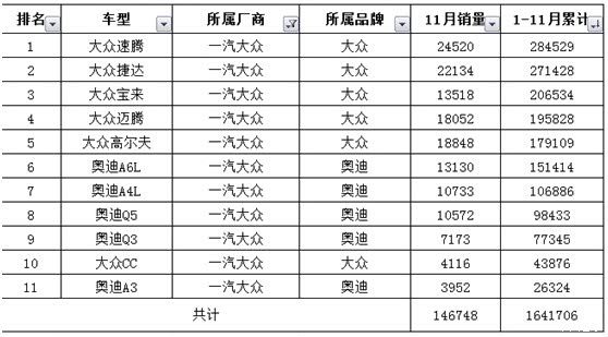 一汽大众作为大众在华的第二家合资企业,虽然一汽大众成立于1991年,但是只用了23年的时间就进入千万辆的行列。2014年12月2日,一汽大众生产的第1000万辆汽车在长春工厂下线,截止今年11月,一汽大众2014年已经累计销量164万辆。