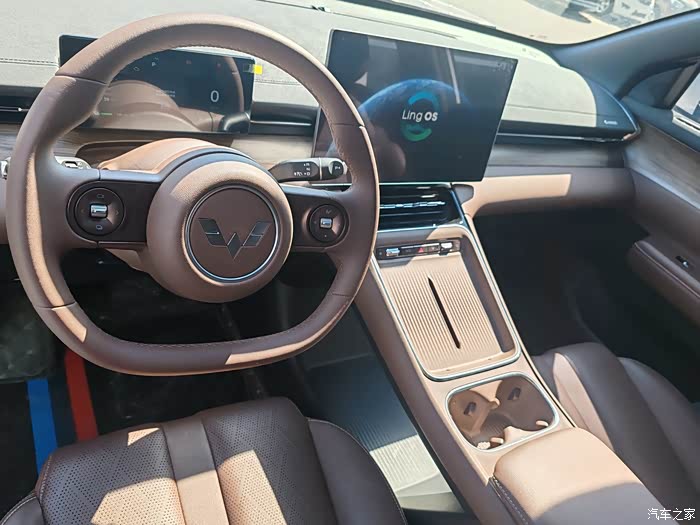 进入车内,环抱式座舱布局搭配大面积软性材质包覆,触感细腻,细节处的木纹饰板提升了整体质感。车内有浅沙、玄黑、椰棕三种配色,我试驾的这台浅沙色内饰,营造出温馨的居家氛围。