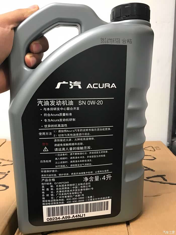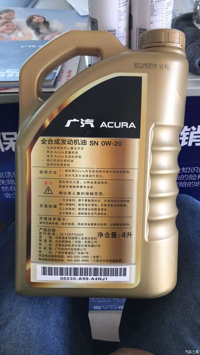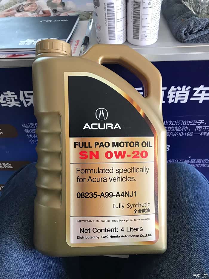原厂机油有两种,一种是灰色桶,一种是金色桶。都是SN,都是0W-20,都是日本老牌出光制造的机油。4S店免费更换的机油是前者。后者是付费款。请注意,和付费的金色桶相比,灰色桶并非全合成机油,也非合成机油。我对这一点耿耿于怀,只是觉得灰色桶不仅免费,而且也是讴歌官方认定的产品,所以一直在用。