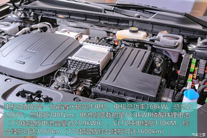 电池方面,130超混版配备的是18.4kWh磷酸铁锂电池,CLTC纯电续航里程130km,CLTC综合续航可达1560km;170超混版配备的是23.9kWh磷酸铁锂电池,CLTC纯电续航里程可达170km,CLTC综合续航可达1600km;