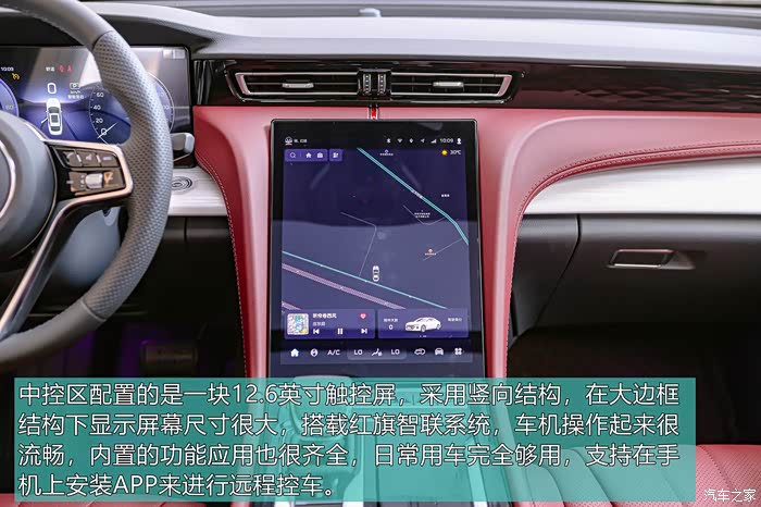 科技配置方面,12.3英寸全液晶仪表盘、12.6英寸竖向中控大屏、红旗智联中控系统、酷我音乐、高德地图、喜马拉雅、爱奇艺、红旗电台等等功能配置和APP应用,完全能够满足日常用车的需求,在中控屏的下方,保留了空调系统的实体功能键,提升了用车过程中的便利性;