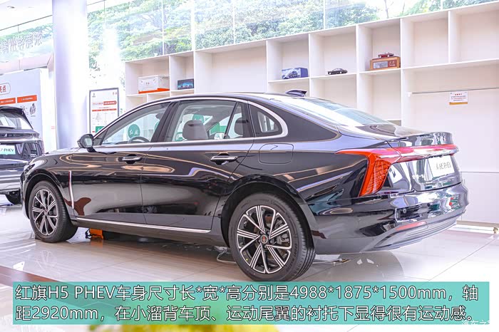 红旗H5 PHEV的车漆颜色有魅夜黑、高山莹白、量子银灰三种车漆,车身尺寸长*宽*高分别是4988*1875*1500mm,轴距2920mm,在流畅的腰线条的衬托下,车身在视觉上显得很舒展,很有优雅感,豪华车型的豪华气质入眼可见。