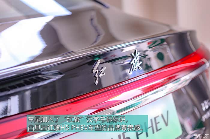 红旗H5 PHEV外观设计上采用了红旗家族化设计语言,红旗H5车型上的经典元素在红旗H5 PHEV上得到了沿袭,标志性的红旗飞翼式前脸、高山流水直瀑形进气格栅、分体式LED大灯、气贯山河旗标、小溜背式运动车身、上翘鸭尾运动尾翼、“红旗”汉字尾标、贯穿式尾灯等细节元素,让红旗H5 PHEV具有很高的品牌辨识度,同时也凸显出红旗H5 PHEV的高贵、时尚、运动的气质;车尾的“H5 PHEV”标识则凸显出新能源车型的身份,与燃油版红旗H5进行区分;