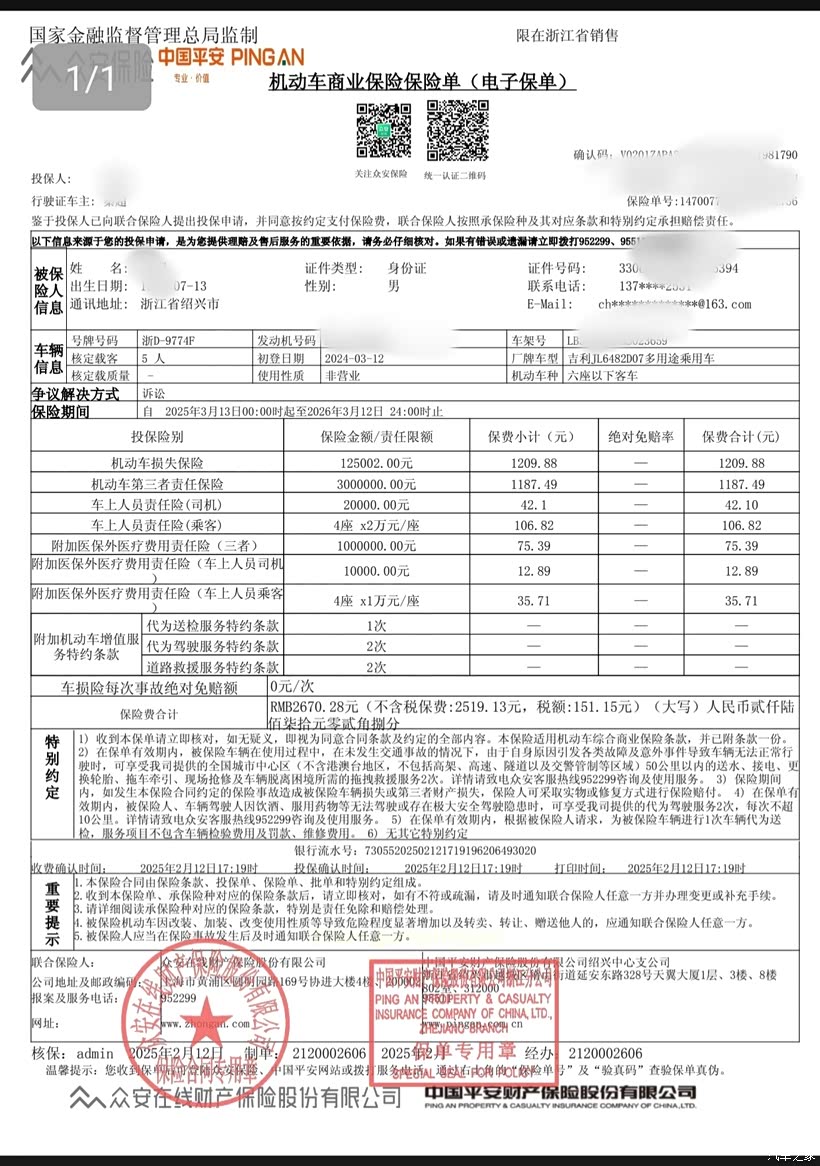 1、机动车损失险:[保额 125002元,保费 1209.88 元]
