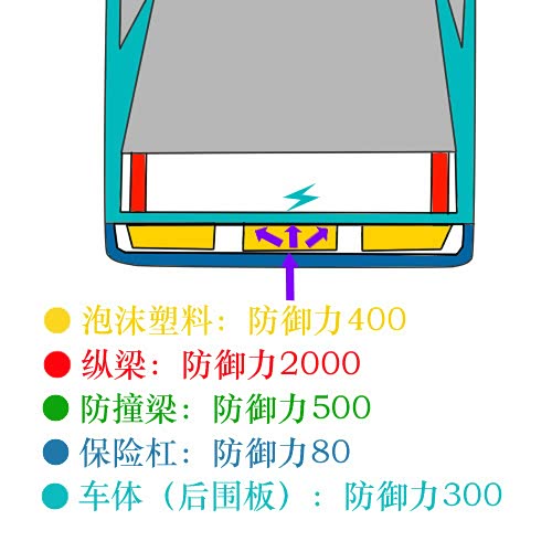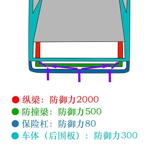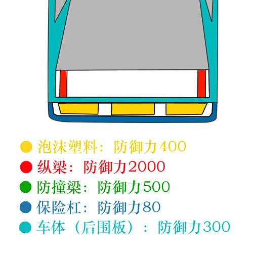 防撞梁:钢梁防御力500,吸能盒具有缓冲功能