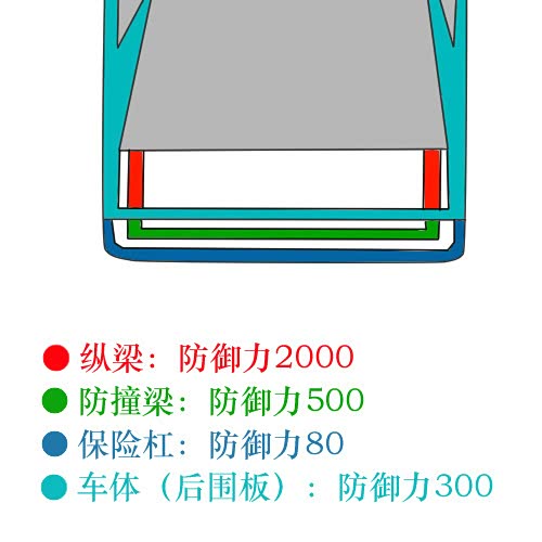 车身(后围板):防御力300 点评:虽然也是钢板,但是因为薄而且中部就靠后底板支撑,其实防御力不怎么高,不如防撞梁