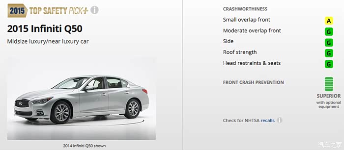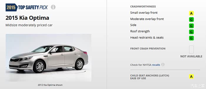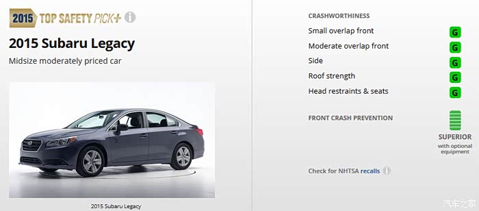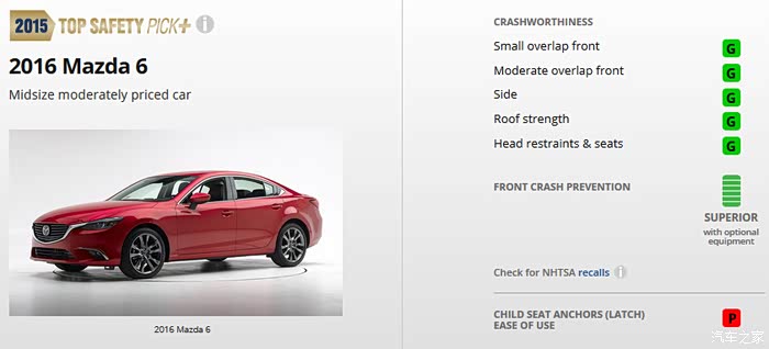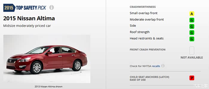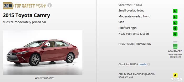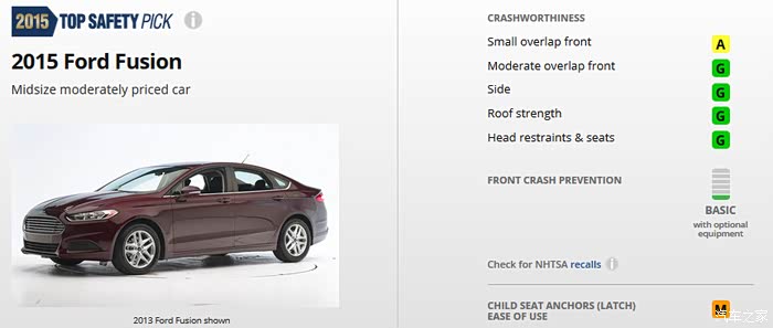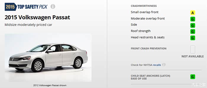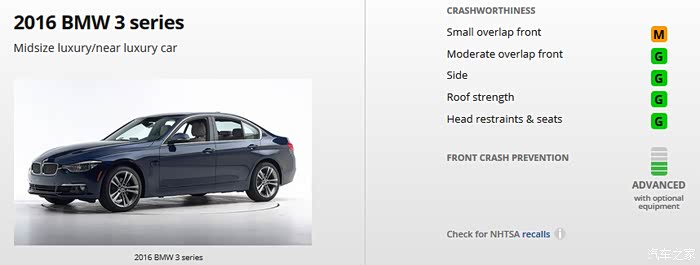 Front small overlap即为“25%偏置刚性正碰”成绩,如果车辆不能通过这个测试,就不能得到“TOP Safety pick +”的最高成绩。一般的中型家用车成绩,其他就不说话,自己看成绩:
