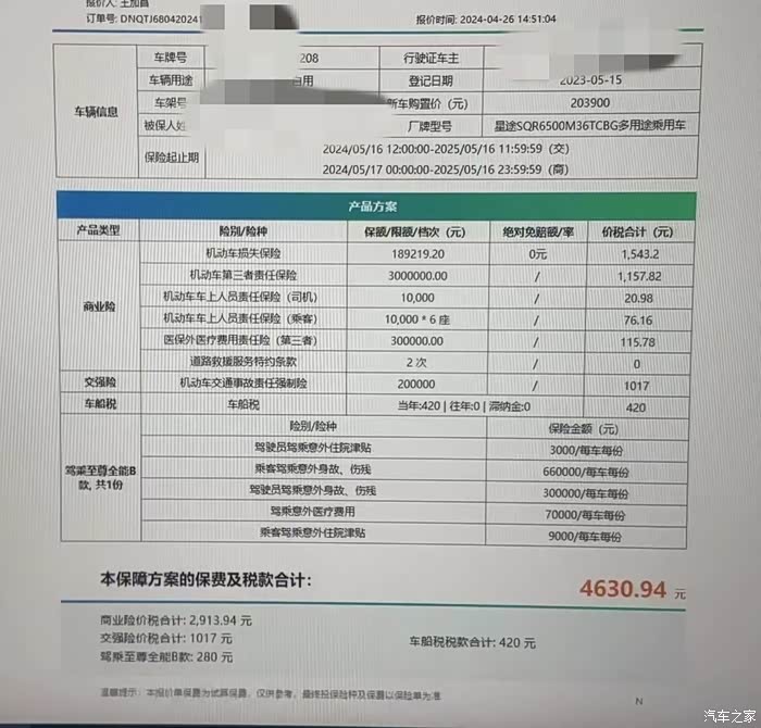 保险:4630.94元。太平财产保险的。亲戚是这家公司的保险销售员,所以没有在其他保险公司做比较。