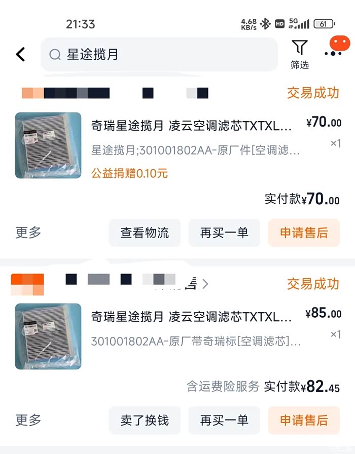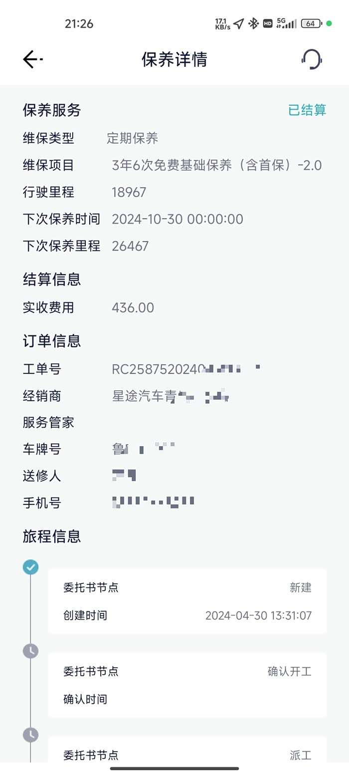 保养费:基础保养436元。虽然厂家赠送了3年6次基础保养,但是我第一年度超次数了,所以第三次保养就要自费了。每次加的都是全合成机油,每7500公里更换一次,第三次的时候还差半个月才满一年,所以无法使用赠送次数。自己更换了两次空调滤芯,自己网上买的,费用152.45元。